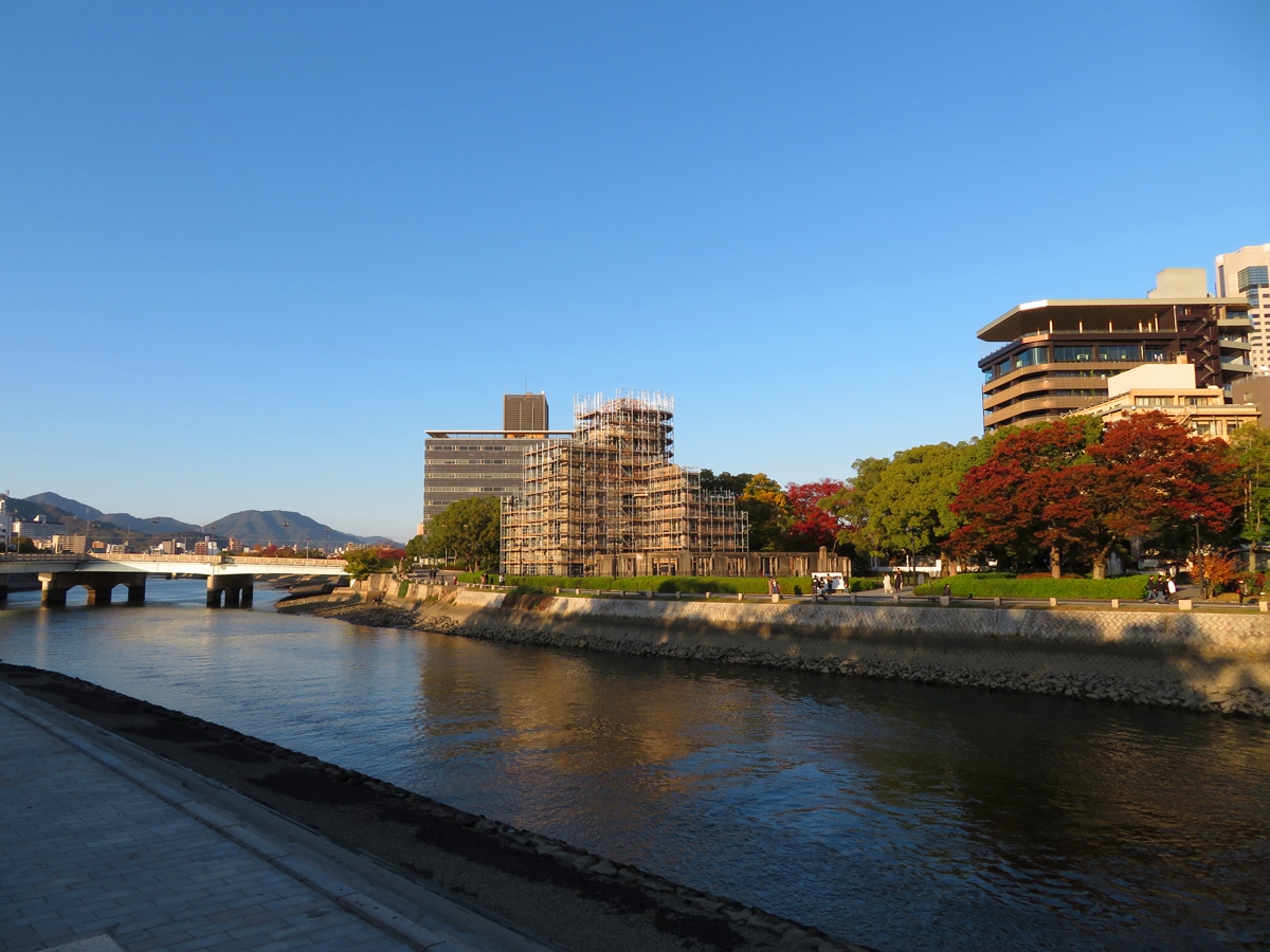 広島のシンボルともいうべき原爆ドーム。世界遺産にも指定される、広島の歴史を今に伝える遺産です。今回の訪問時は劣化が進む部分を修復するため、耐震等の工事中で足場が組まれていましたが、貴重な遺産を未来に残すための重要な作業をみることができる機会ともなりました。広島観光では外せないスポットです。
