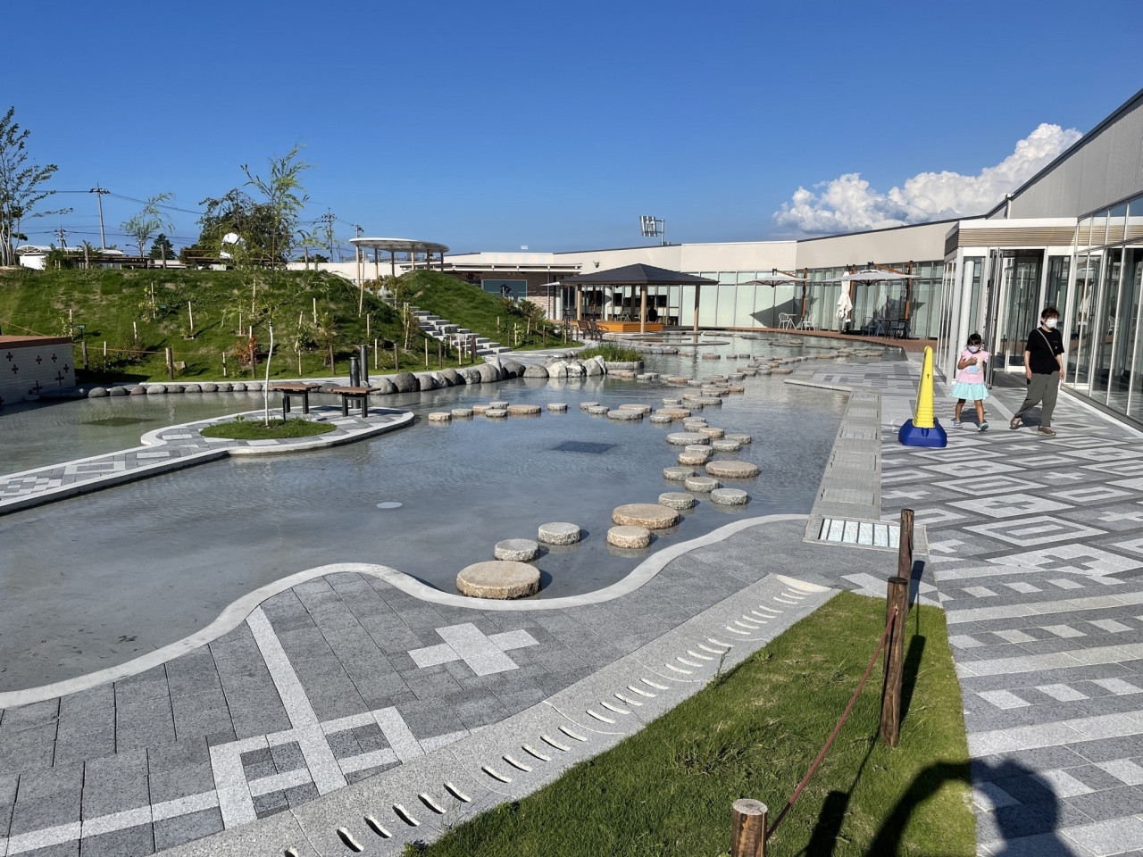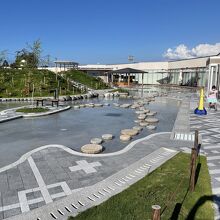 野菜の直売場やフードコートなど、どこにでもある道の駅の施設ですが、敷地の中心が丘のようになっていて遊具や水のお庭になっていました。名水の里らしい演出ですが、この丘の上から天気が良かったので立山連峰を望むことができました。