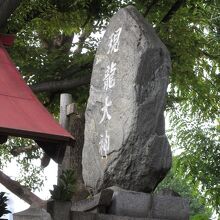 御神体なのでしょうか「現龍大神」と刻まれた大きな石が、左右の狛犬に守られるようにそびえたっていますが、それ以外には、小さな石塔と、赤い屋根と柱だけの社殿らしき建物があるだけで、参拝・参詣している方は少ないのかもしれません。