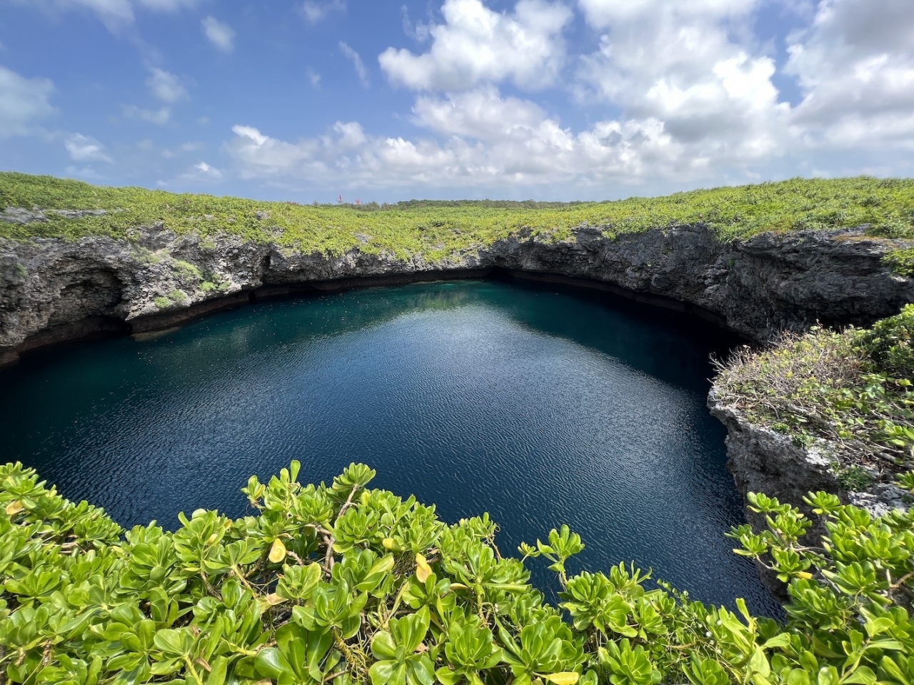 石灰岩の浸食で形成されたすり鉢状の窪地に海水が満たされた池で、海につながる洞窟はダイビングスポットになっているようです。