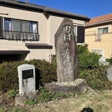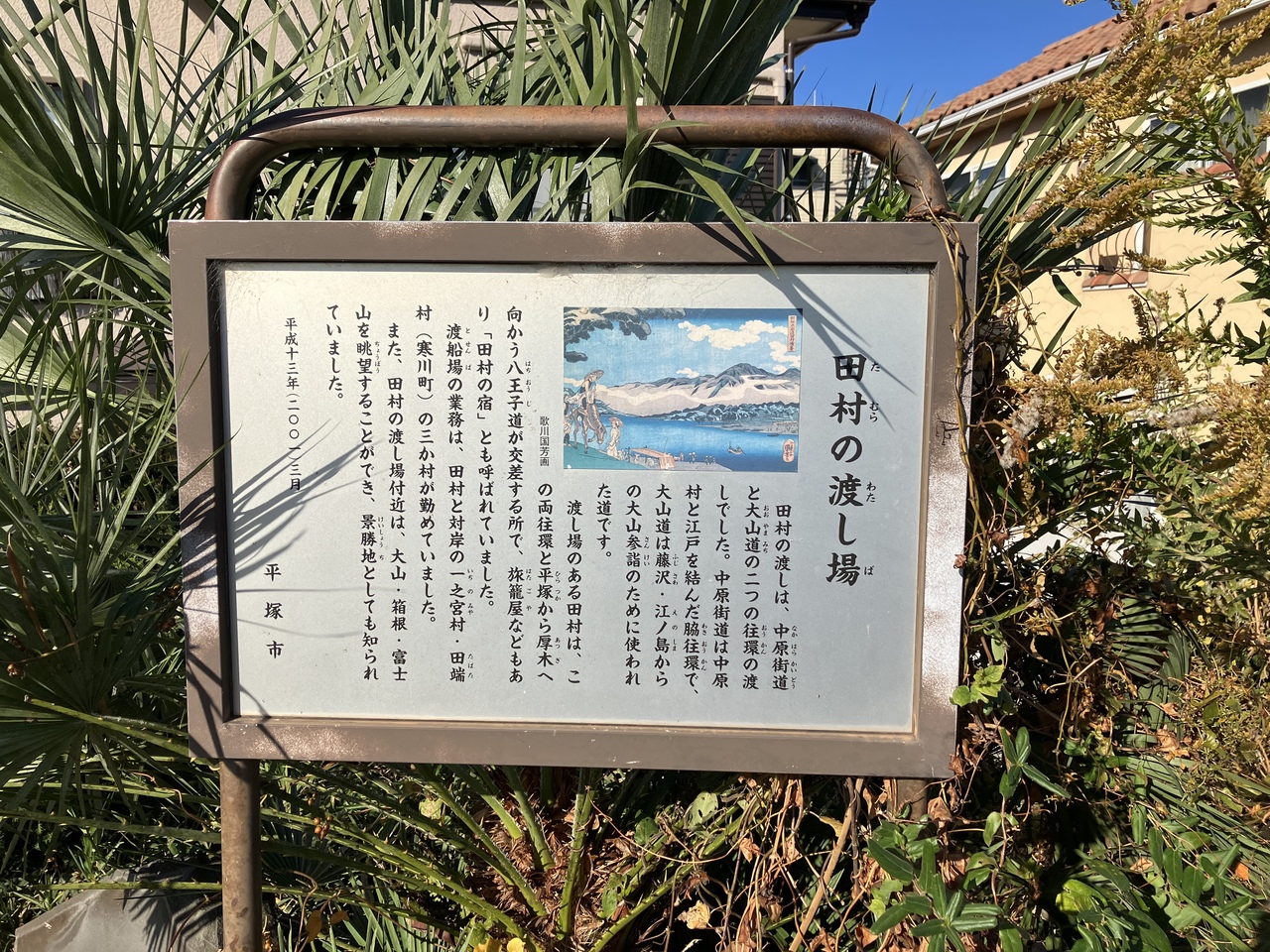 JR相模線「寒川駅」から徒歩で30分ほどです。相模川に架かる「神川橋」の平塚市田村の相模川堤防の一角に石碑が建っています。田村は江戸時代に江戸と平塚を結ぶ中原街道、藤沢から大山に向かう大山街道、平塚と厚木を結ぶ八王子道の交差する地として栄えた幕府直営の渡しだったそうです。今は近代的な大橋が架り、圏央道の高架が時代の流れを感じます。