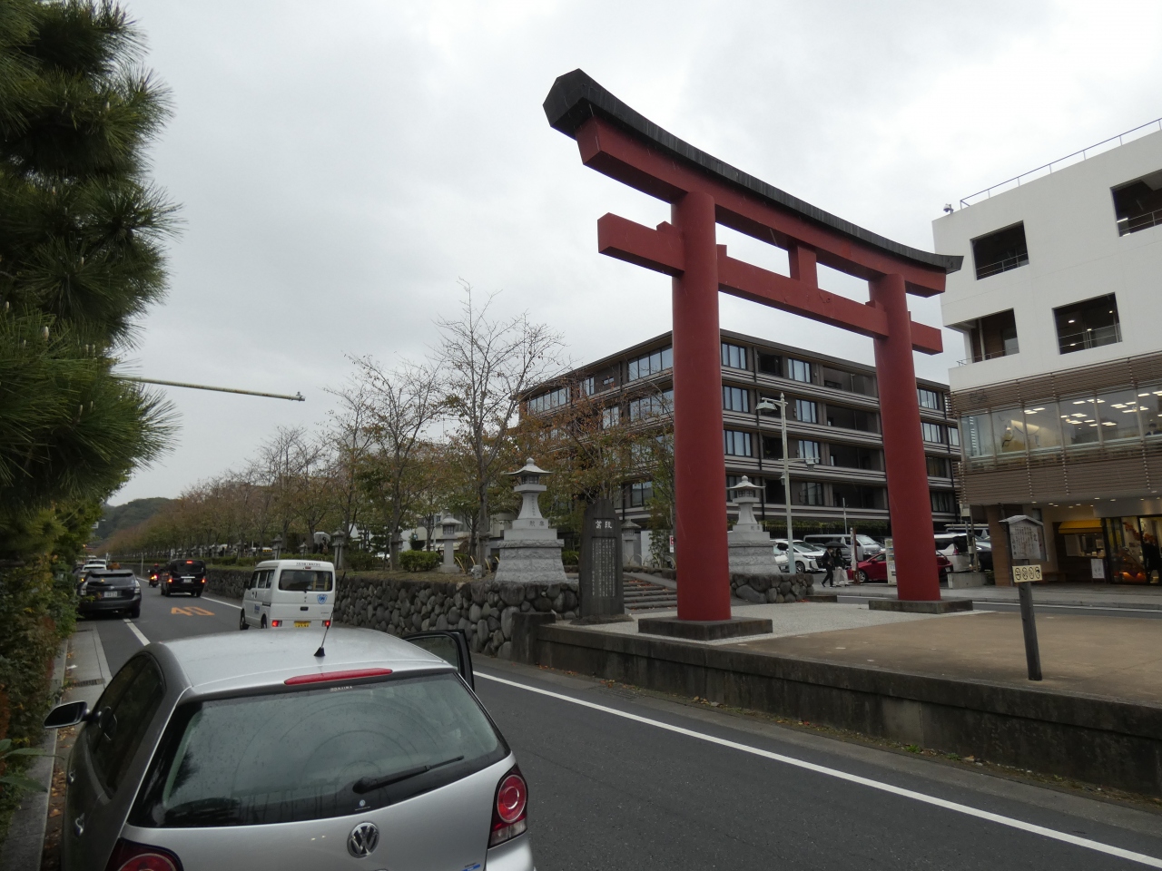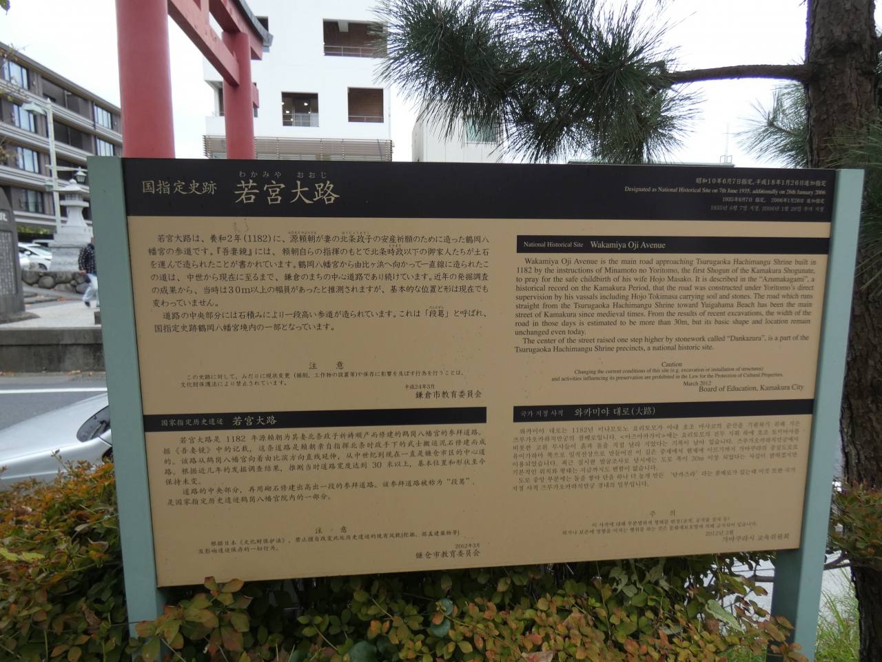 武士の都・鎌倉の中心の道が若宮大路。若宮とは鶴岡八幡宮の若宮社殿の事で、平安京の朱雀大路になぞって寿永元年(1182)源頼朝によって鶴岡社頭より由比浦迄の道の曲りを直して造立された約1.8㎞の参道です。途中に三つの鳥居が建ち、由比が浜側から「一の鳥居」の順です。「二の鳥居」と「三の鳥居」の間は中央が盛土で高くなった段葛は有名です。素晴らしい大路です。