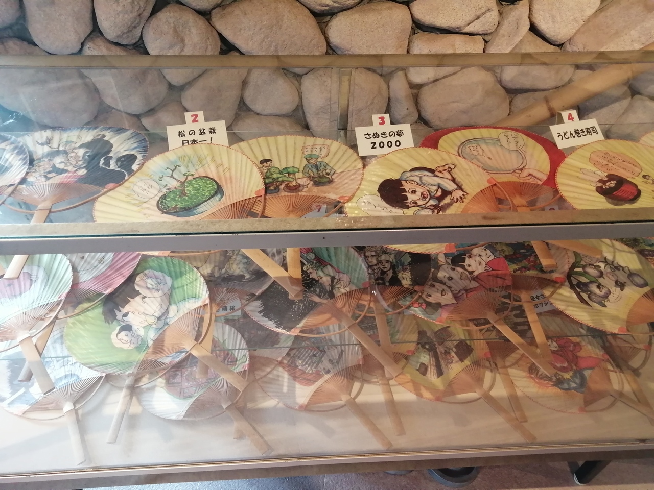 丸亀の名産品、“うちわ”のことが知れるミュージアム。見学無料なら行ってみたくなります。うちわの歴史や制作過程の紹介、全国のうちわの展示や制作実演など盛り沢山の内容です。展示コーナーの一画にはあの楳図かずお先生の絵柄が描かれたうちわが…。香川の観光地や物産をモチーフにしたもので、その数実に41本。驚きました。