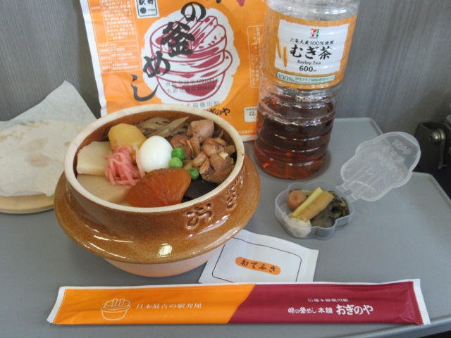 荻野屋・峠の釜めしは今は無き、信越線横川駅で発売開始され、その昔かつて交通の難所と呼ばれる碓氷峠をこえるため、横川駅で連結作業停車時間に合わせ販売したところ大ヒットしたそうです。今年で64年を迎え、今なお多くのファーンから愛され続けています。現在は新幹線開通にともない廃線となった碓氷峠の区間は、現在も廃線となった線路やトンネルや橋の遺構が残されています。そしてこの峠の釜めしを購入するため高崎で買うことができました。どっしりと重みのある陶器と使い捨てのパルプモールドの二種類があります。当然重厚感のある懐かしい陶器を購入しました。おふくろの味わい深いお弁当は旅の楽しみでもあります。グリーン車に乗車して、乗車している人のいないところでいただく味わい深い贅沢なお弁当でした。陶器は持って帰りましょうね様々なお料理に使えますよ。