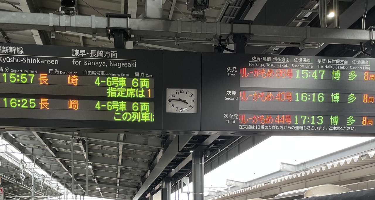 武雄温泉では同じホームの向かいの新幹線に乗り換えるようになります。乗り心地は白よりも黒というかグレーの車両のほうが良かったです。