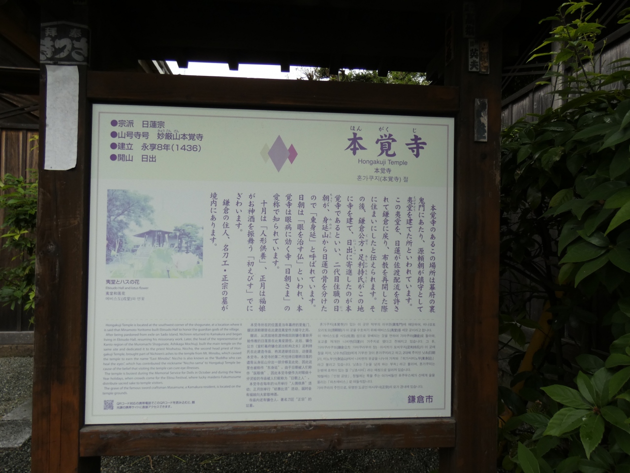 JR鎌倉駅東口から東へ徒歩3分の場所に建つ日蓮宗寺院。足利持氏が鎌倉の夷堂があった場所に寺を建て、日出上人に寄進した寺院です。格式ある山門と本堂が素晴らしいです。本尊は釈迦三尊像で、身延山久遠寺にあった日蓮の遺骨を分骨したため「東身延」とも呼ばれます。山門を入った境内右側には夷堂が建っています。