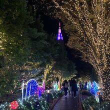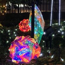 キラキラの木々に囲まれた小路に、宝石のような輝きのオブジェが散らばっています。