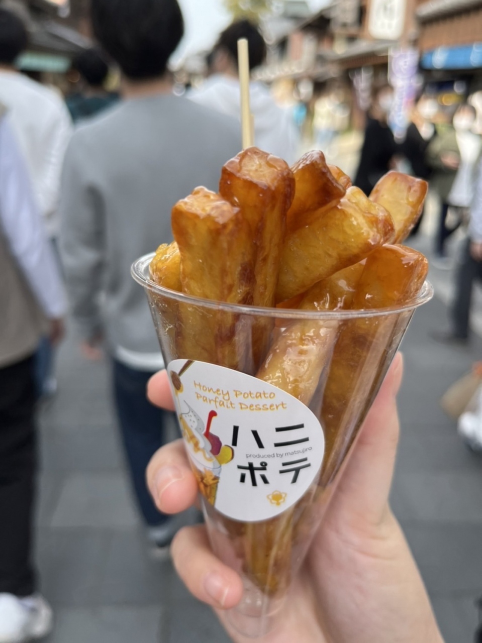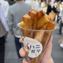 てこねすし、干物はおすすめですが、食べ歩きとしては、こちらのポテトや、お煎餅、コロッケなど沢山あります。