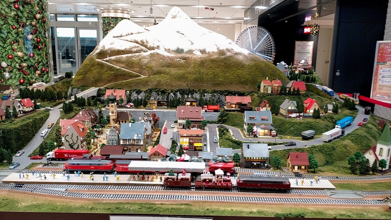 ユニモールの端っこ、地下鉄国際センター駅側にはジオラマが展示されていて模型電車が走っていました。
