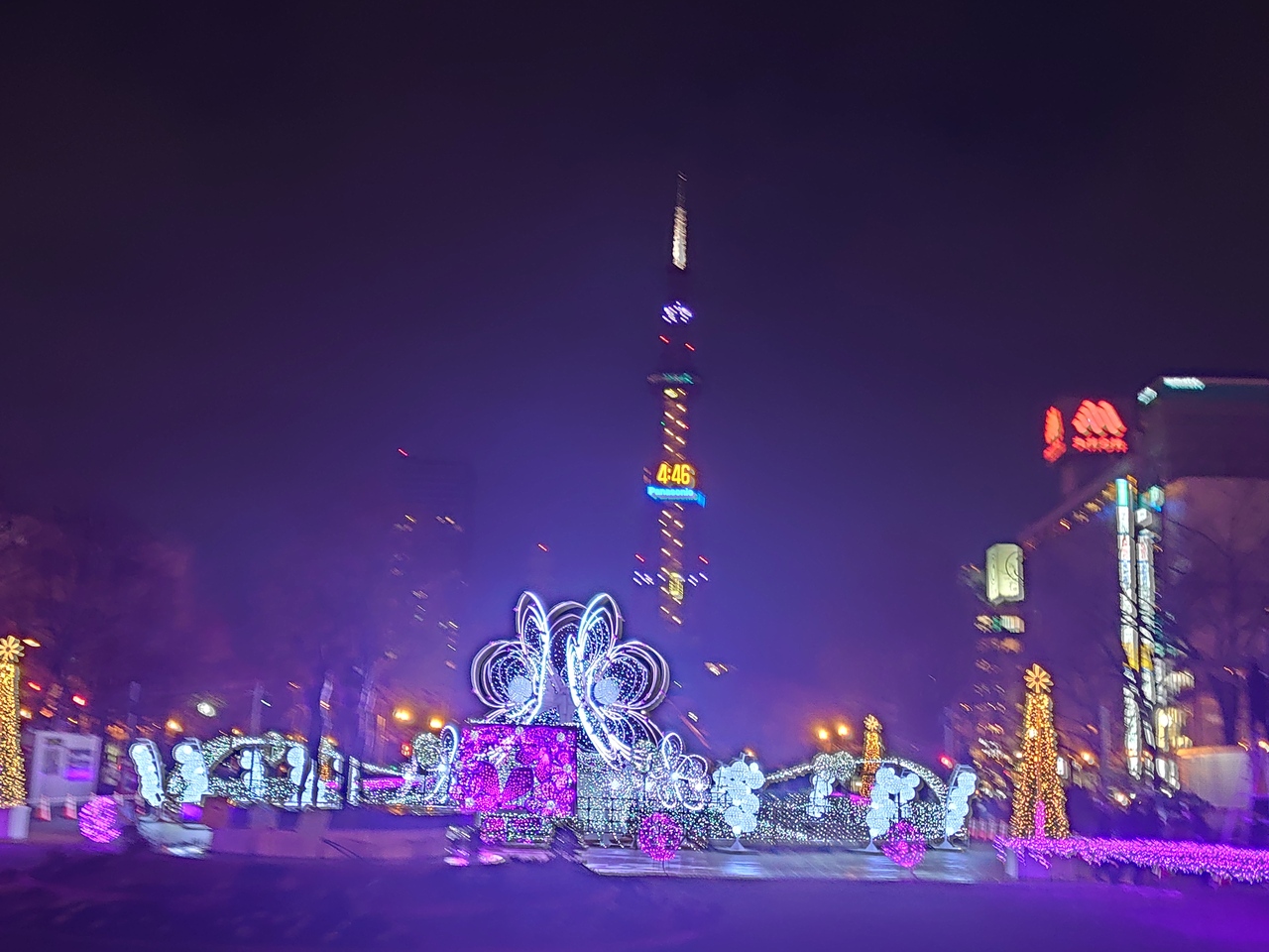 前回来た時と異なり雪こそ降ってないものの、すでに公園はイルミネーションでライトアップされてました!キラキラ光るネオンに札幌市民や観光客も釘付けになってます。当然ながら噴水はもう出てません。装飾によってはデートスポットや家族連れで撮影してインスタしたら映えるかも!?