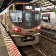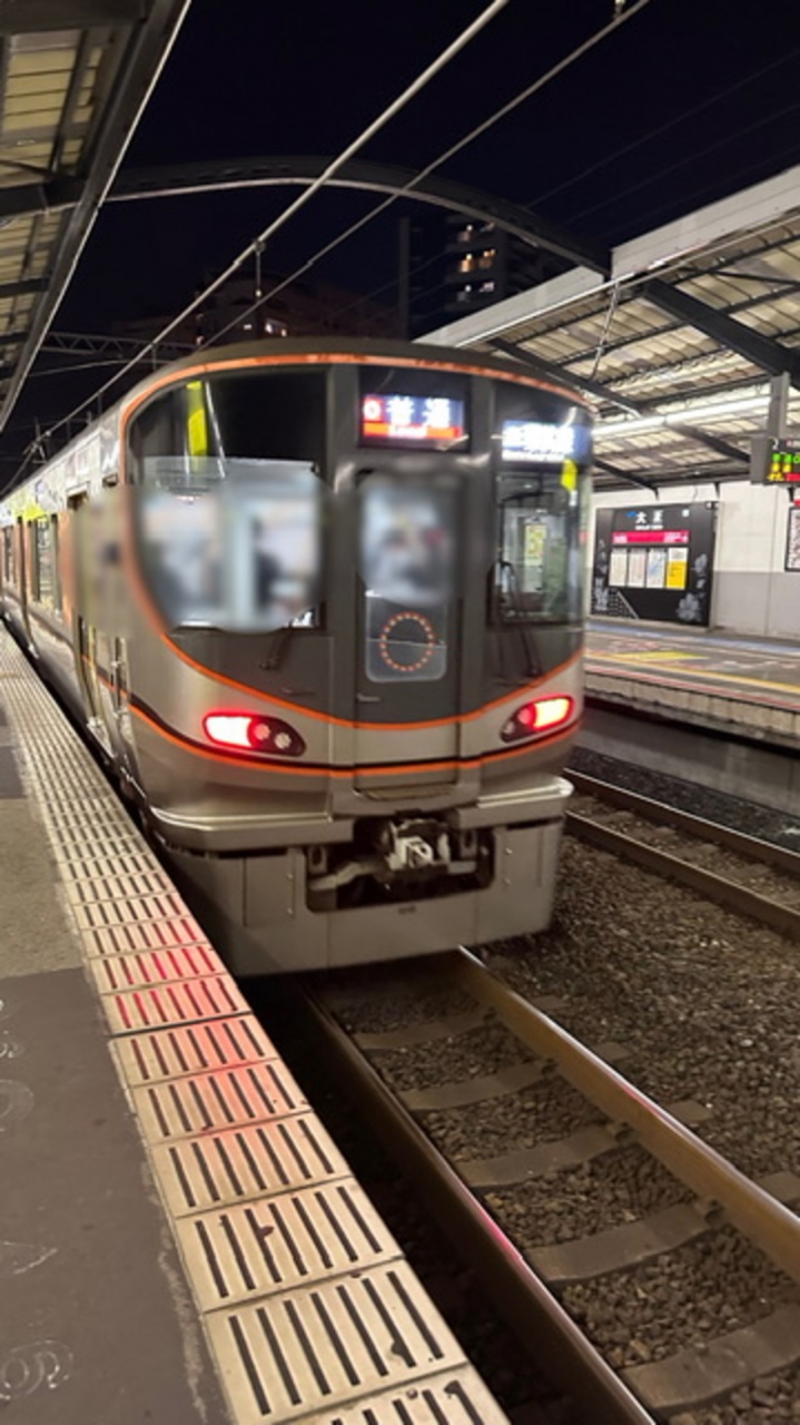 車両は323系オールロングシート車両、ラッシュのすんだ夜の時間帯だったためか、無事座れました。