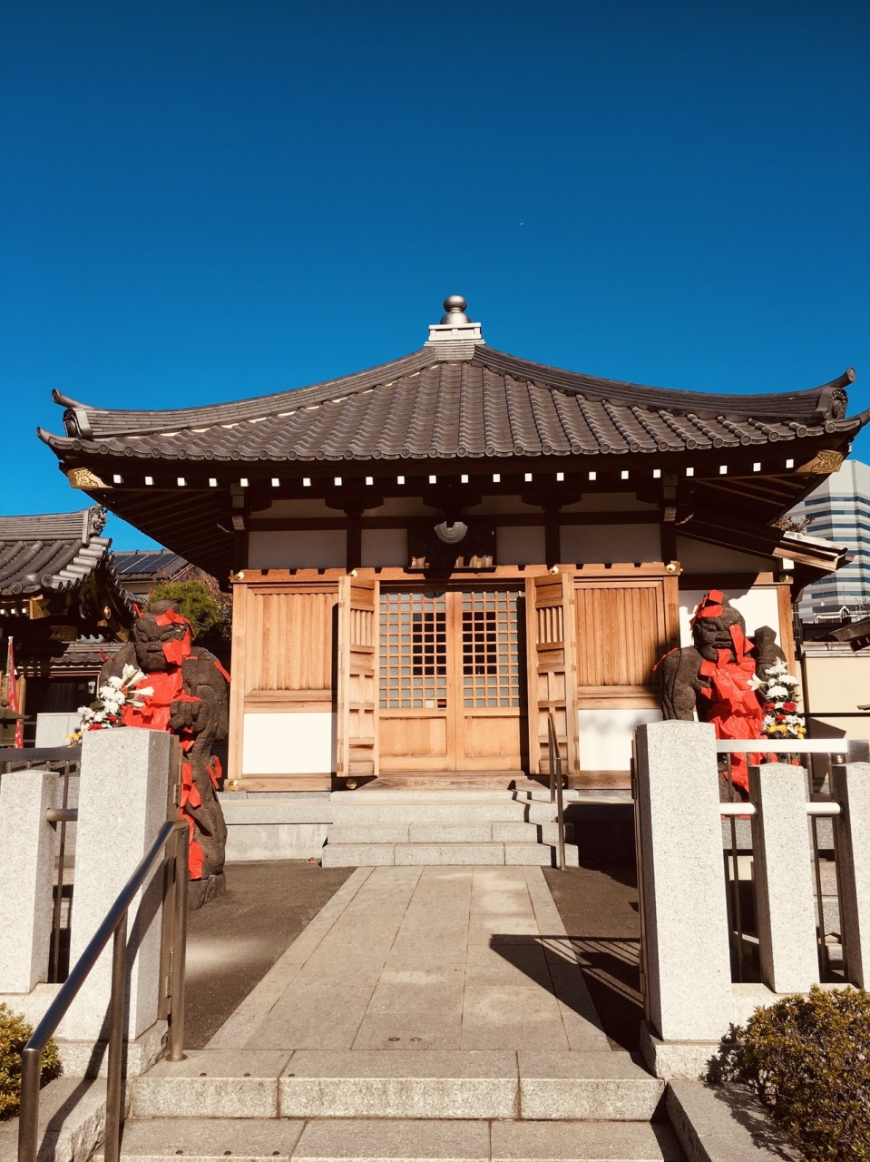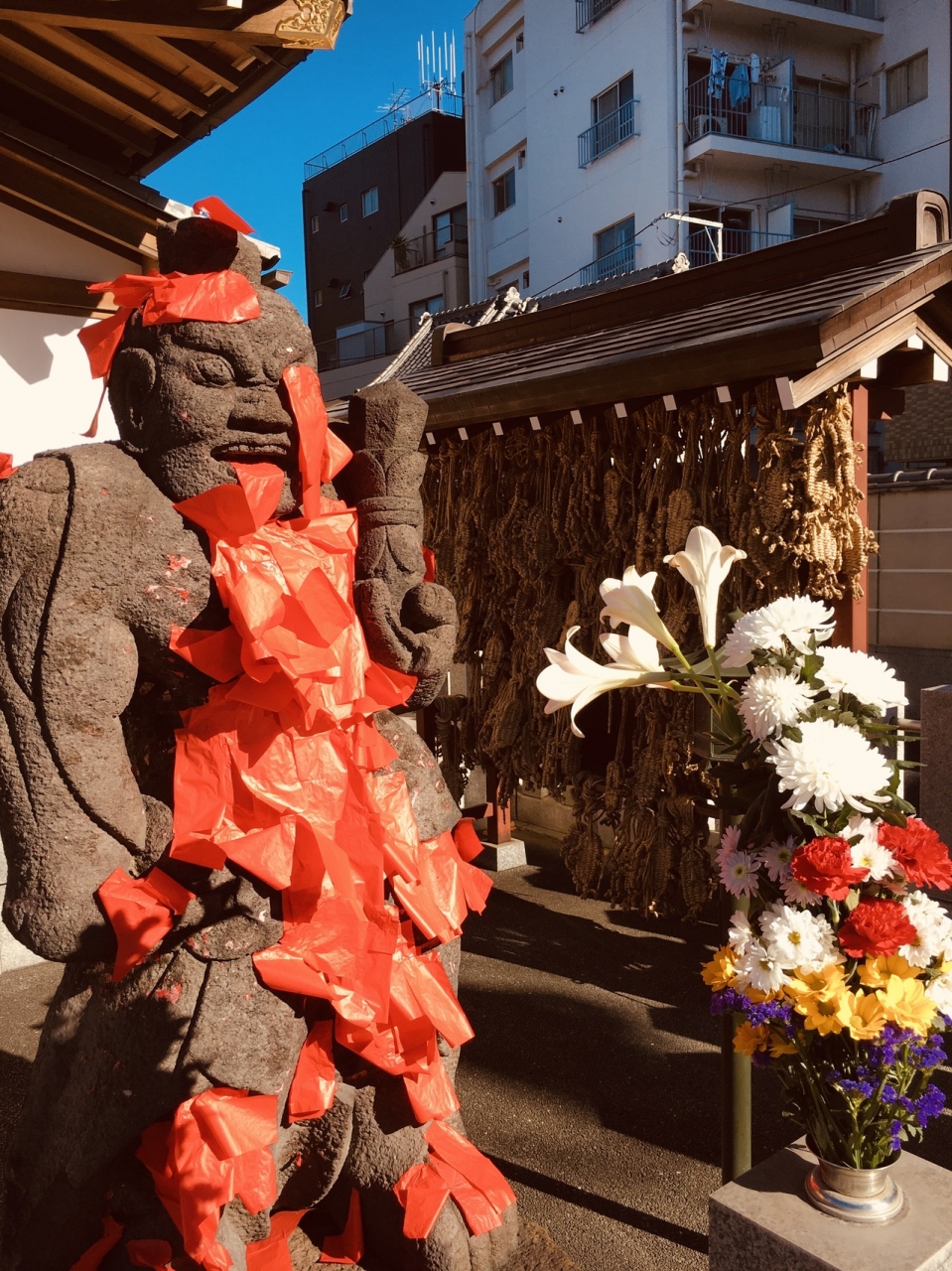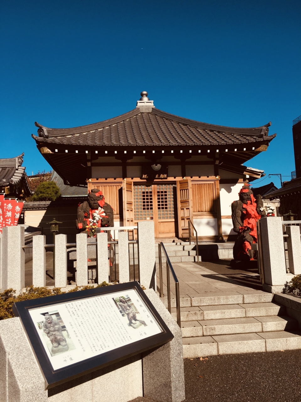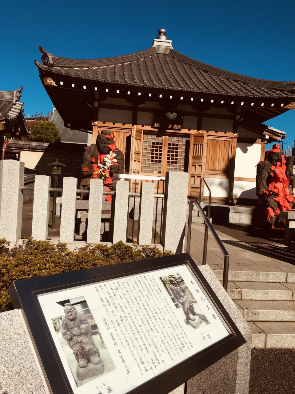 隣接して神社がありました。境内に入る右側の不動堂前には赤紙仁王像があって、像に赤紙がたくさん貼り付けてありました。横には草鞋がたくさんぶら下がっていました。境内の本堂は大きく、左横に弘法大師像がある静かなお寺でした。