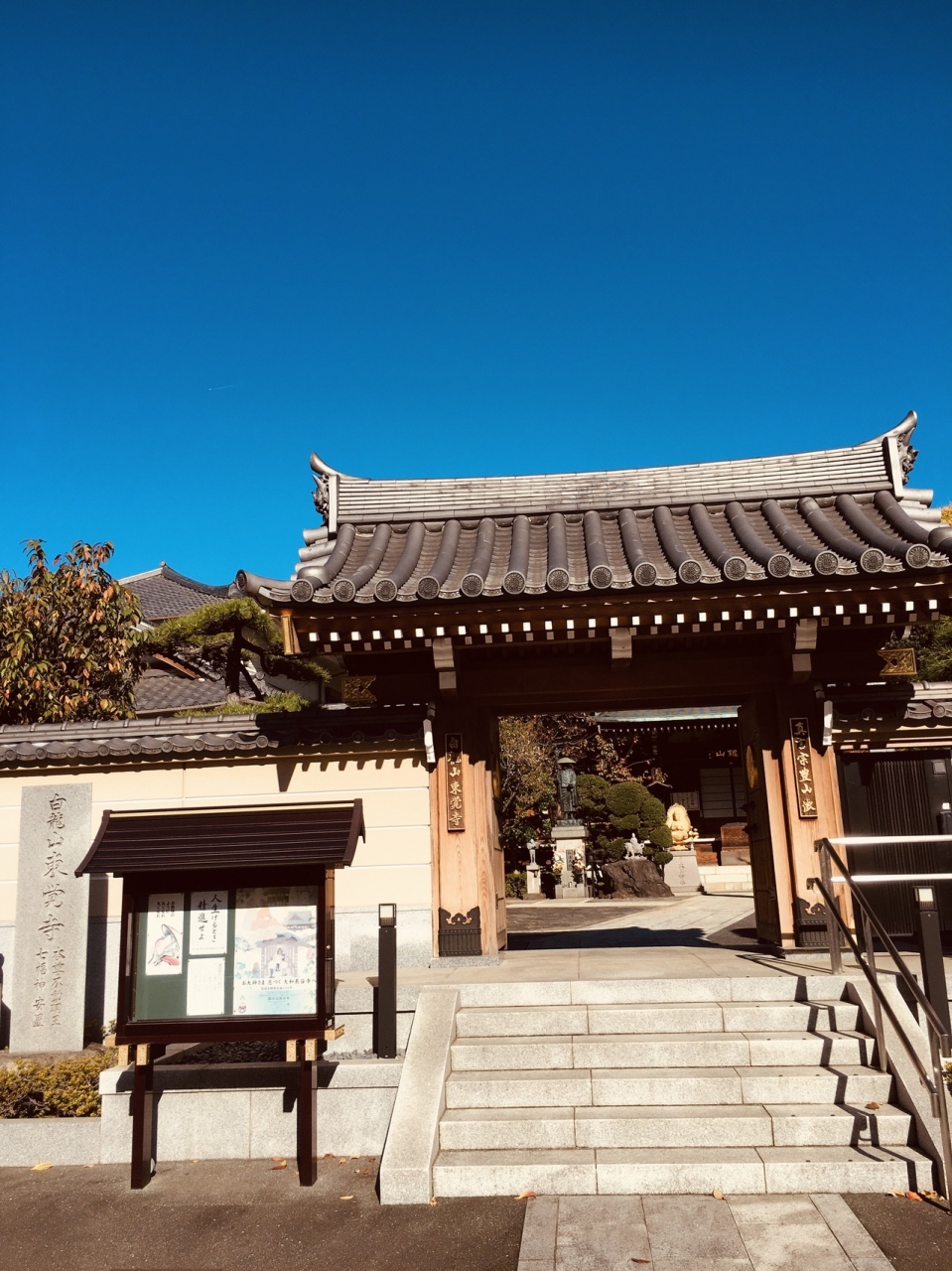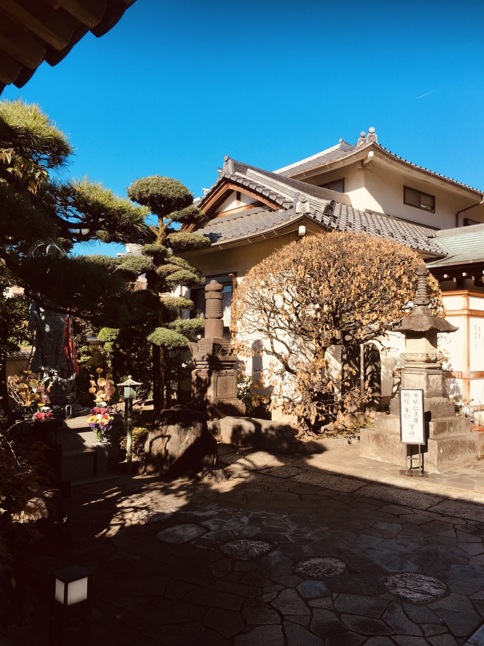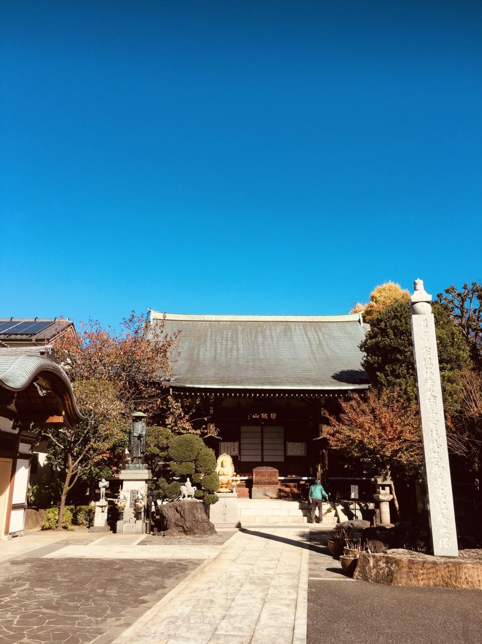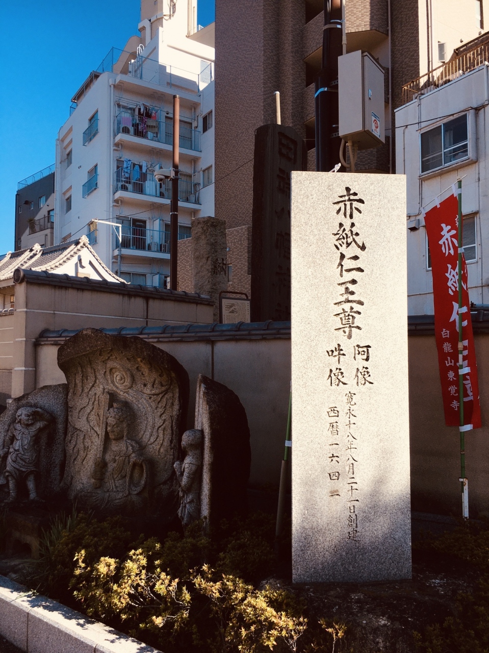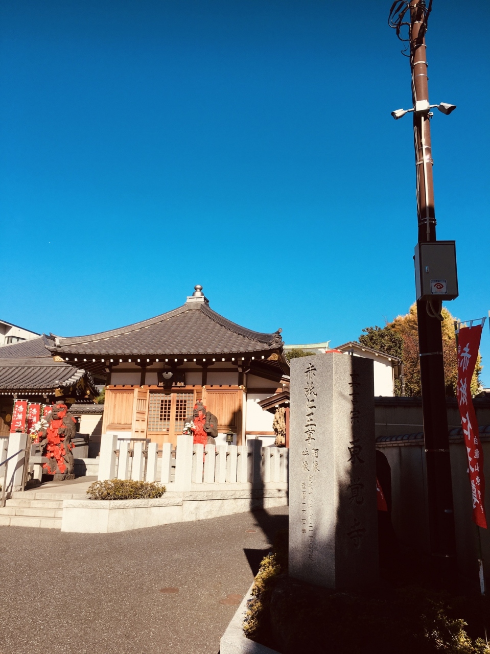 隣接して神社がありました。境内に入る右側の不動堂前には赤紙仁王像があって、像に赤紙がたくさん貼り付けてありました。横には草鞋がたくさんぶら下がっていました。境内の本堂は大きく、左横に弘法大師像がある静かなお寺でした。