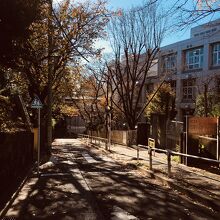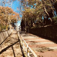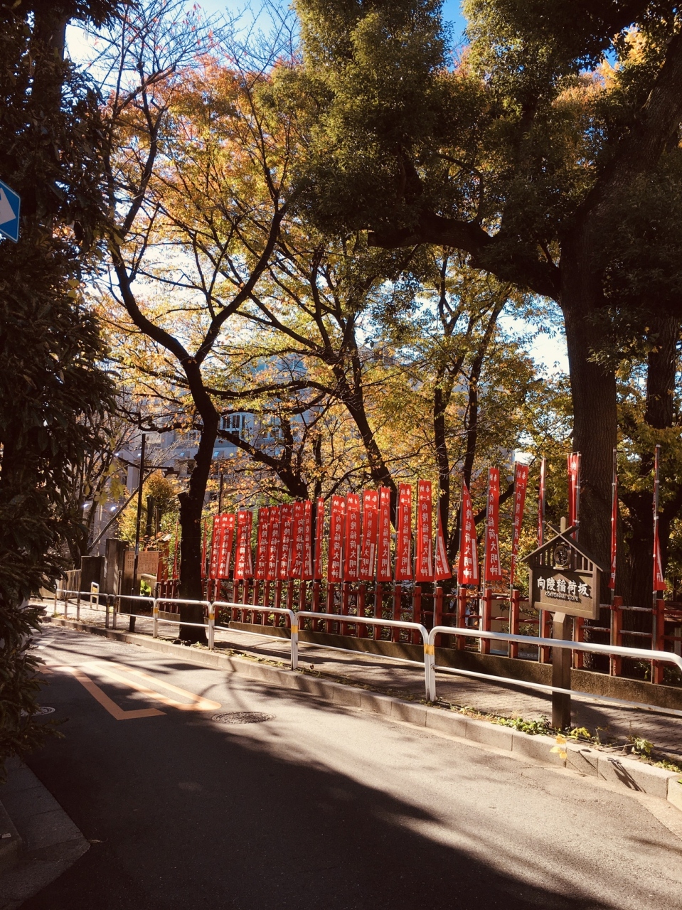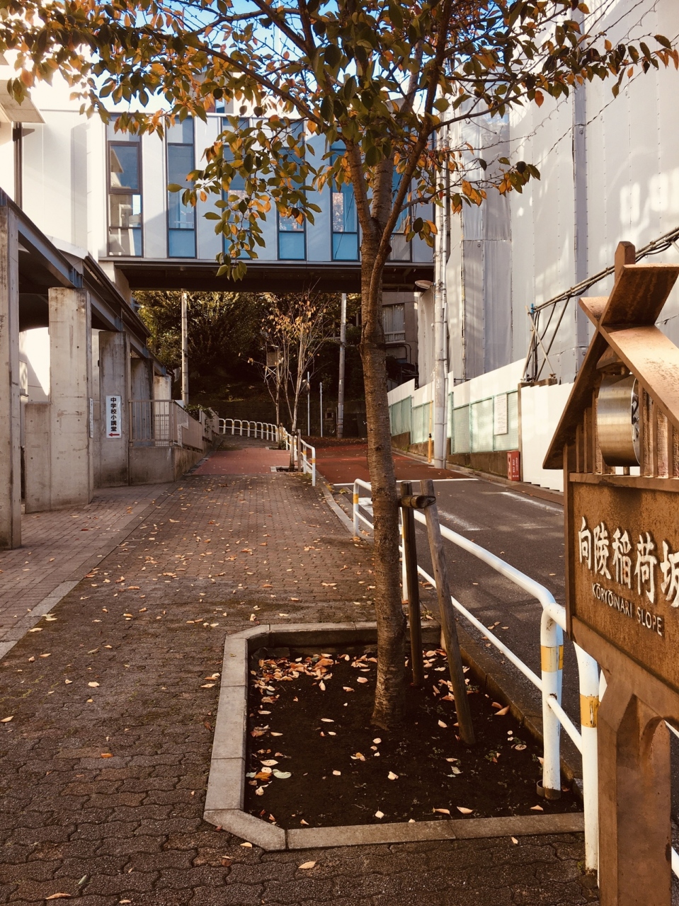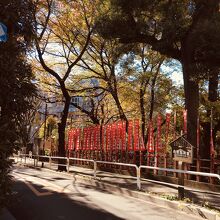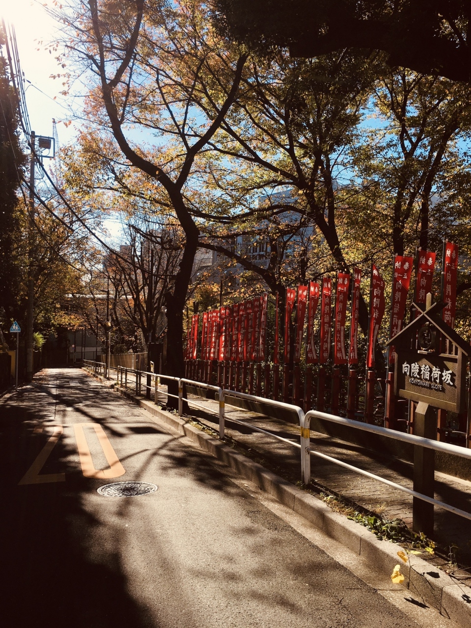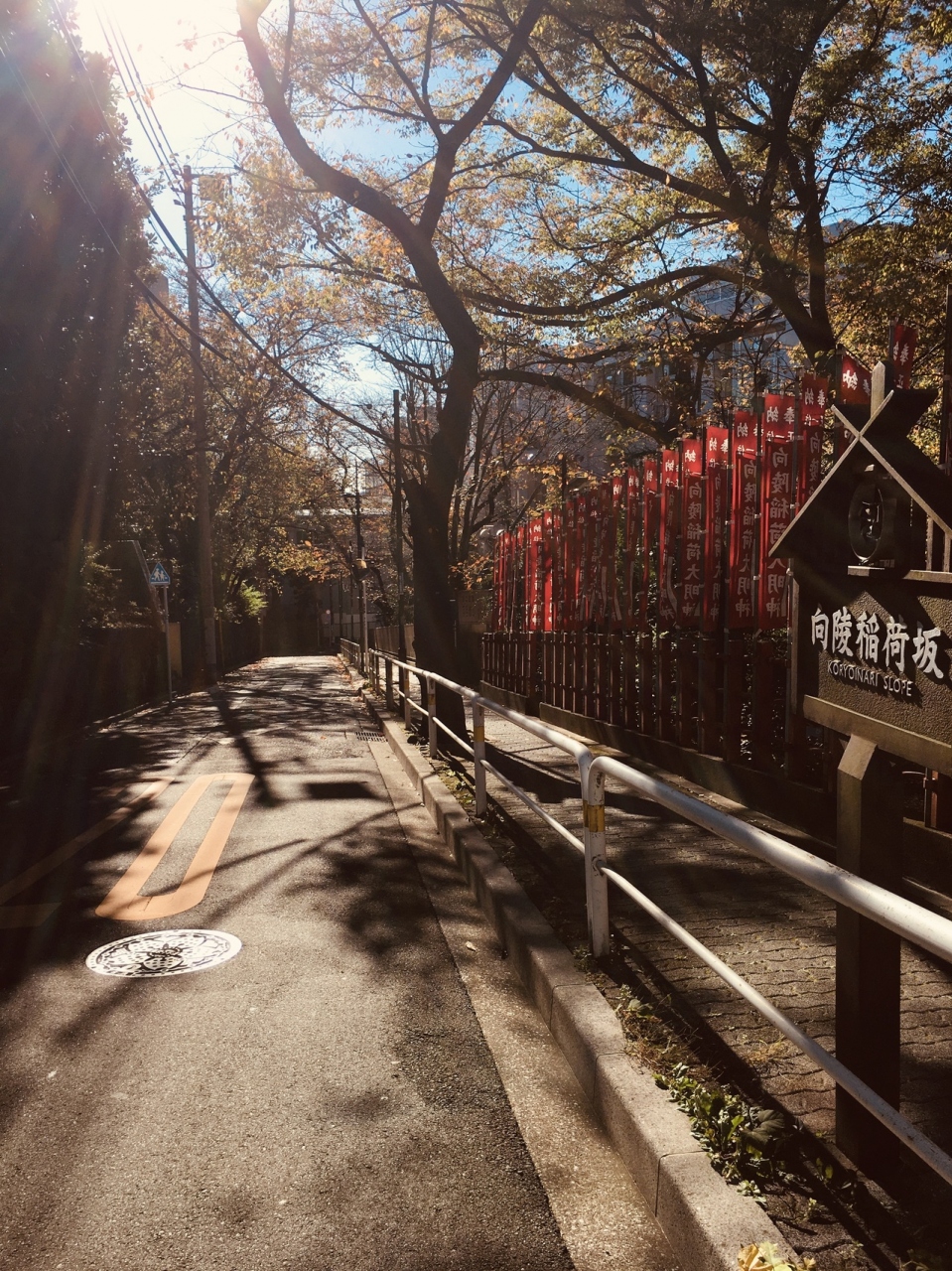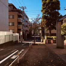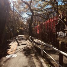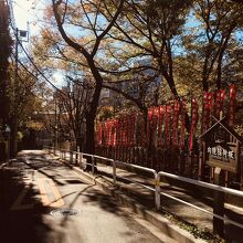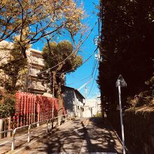 住宅街にある坂で名門開成学園を突っ切るような坂道で下から上がると左にカーブしていて、カーブしたあたりから傾斜が少しありました。左右に学校の建物を見ながら上がると赤い幟がたくさんある神社が左側にありました。