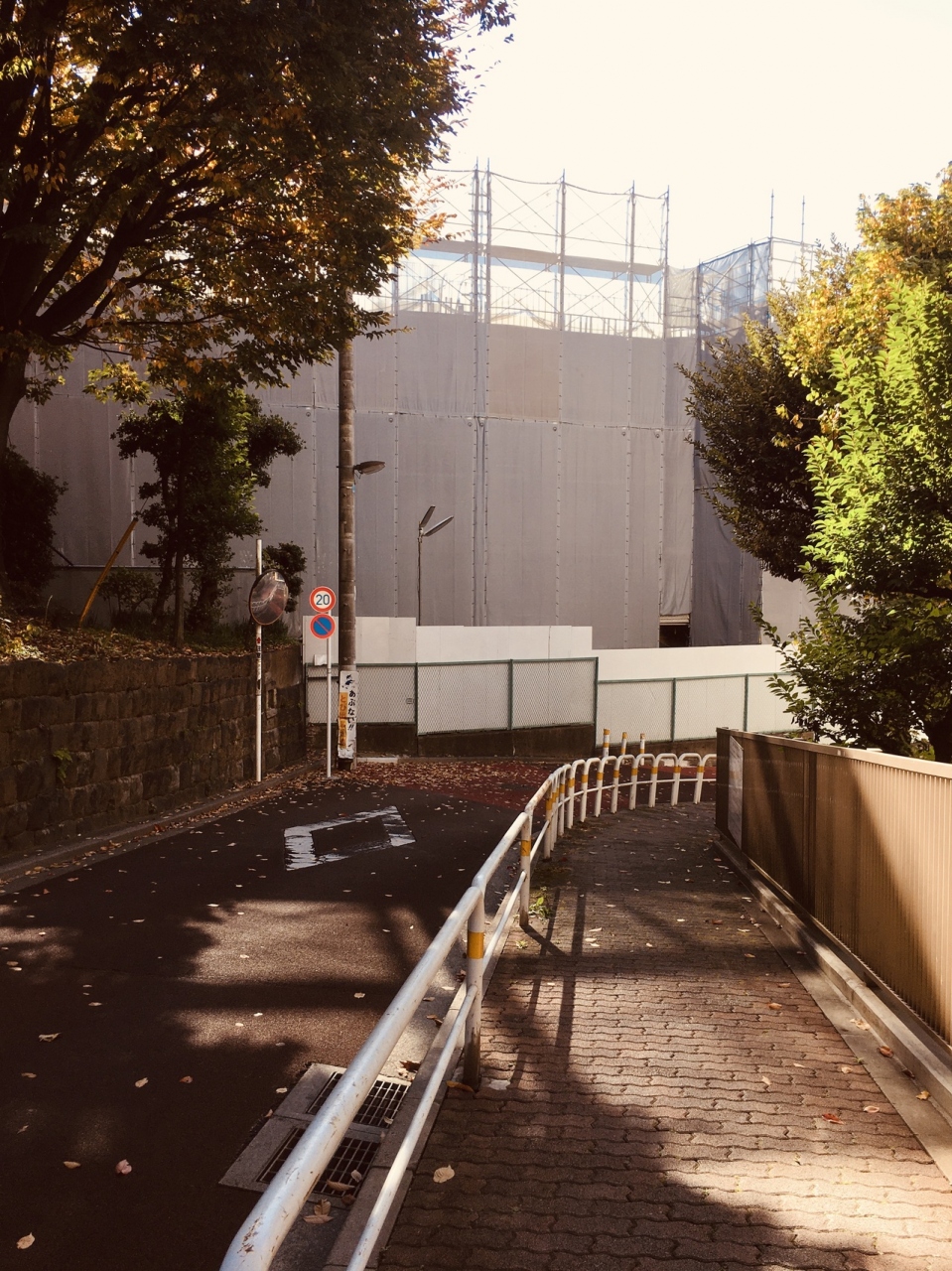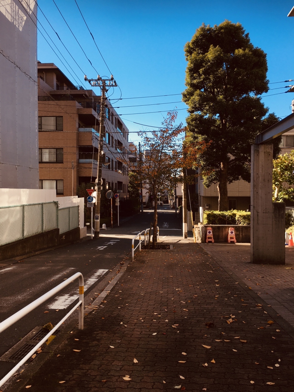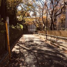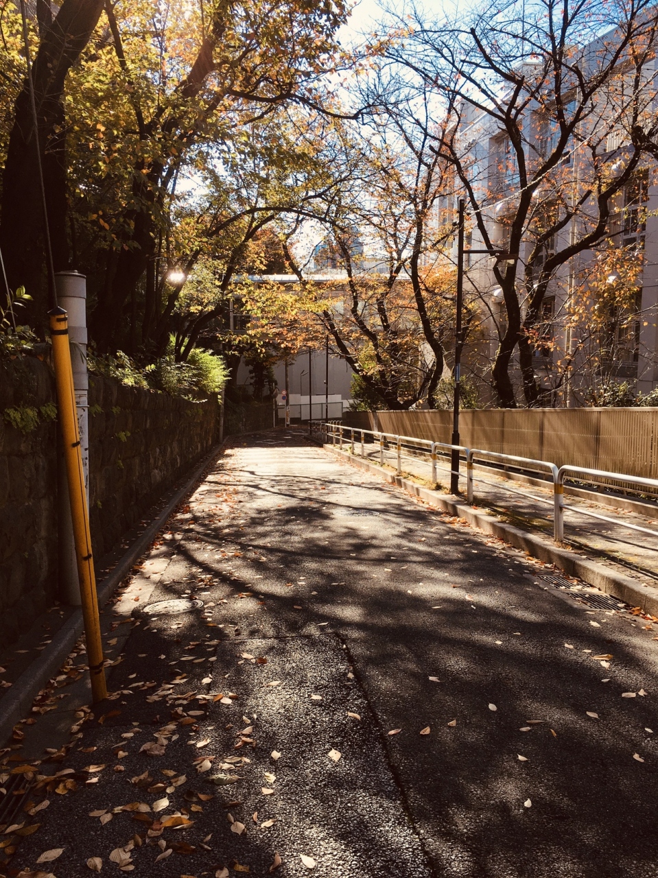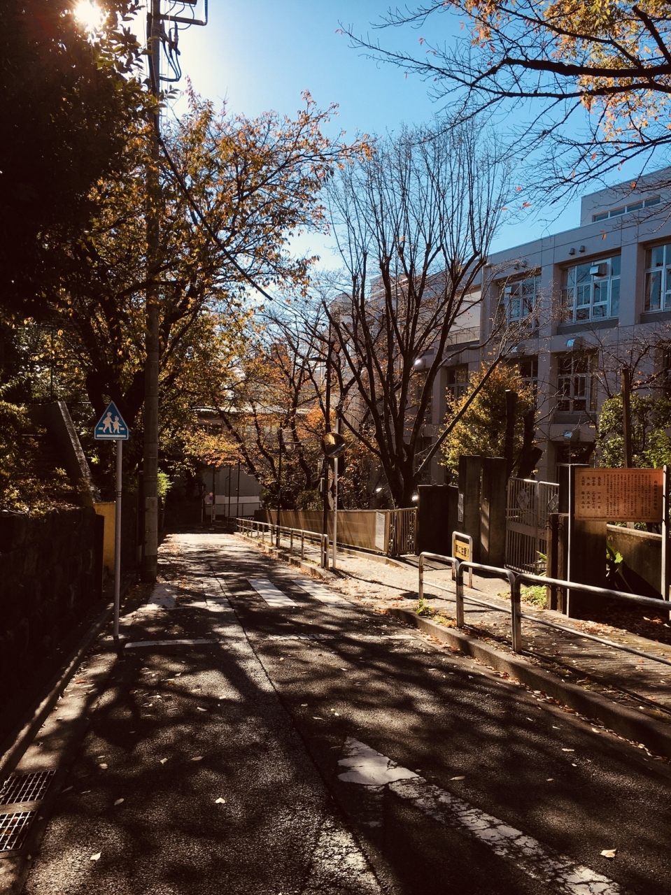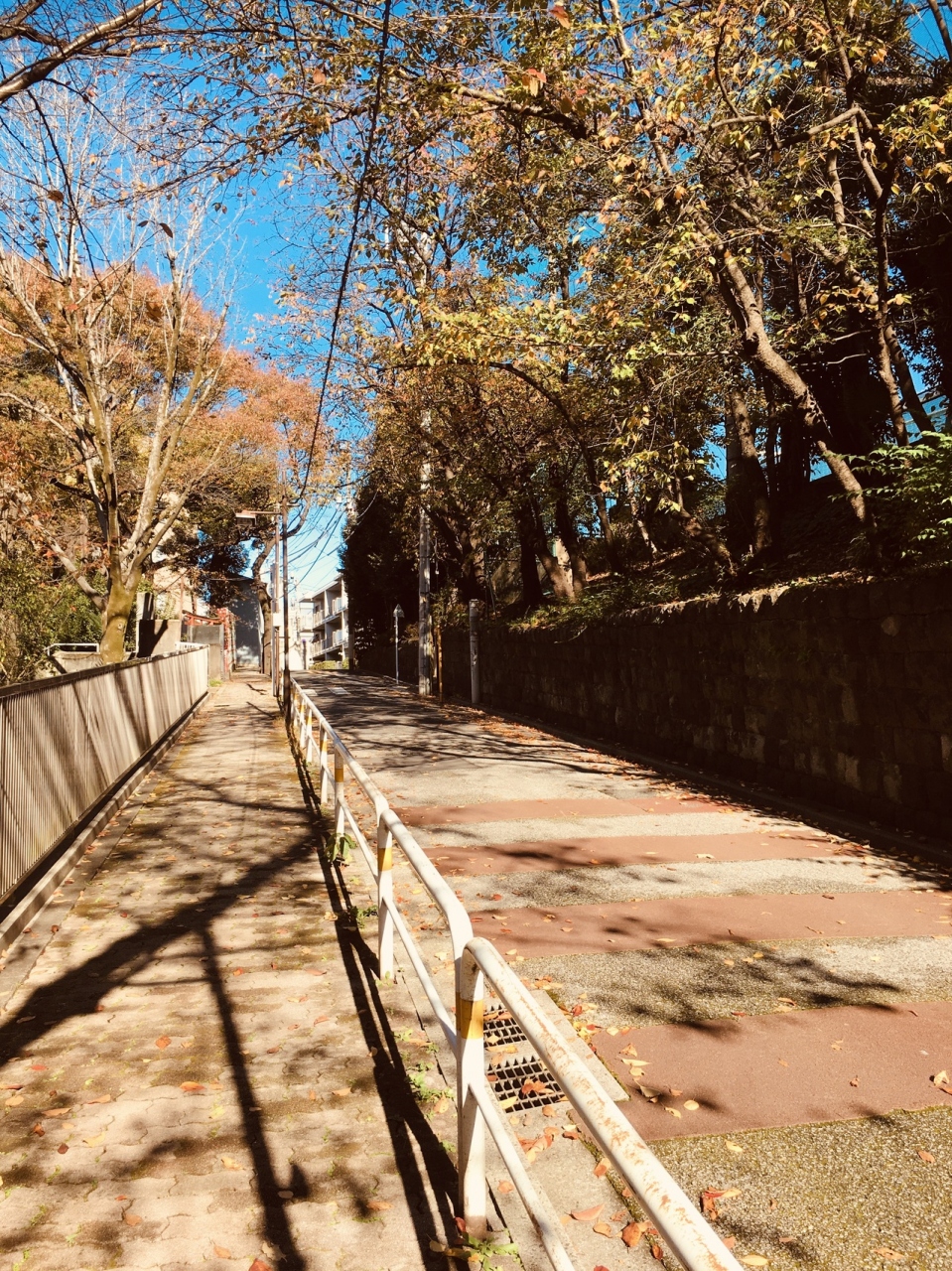 住宅街にある坂で名門開成学園を突っ切るような坂道で下から上がると左にカーブしていて、カーブしたあたりから傾斜が少しありました。左右に学校の建物を見ながら上がると赤い幟がたくさんある神社が左側にありました。