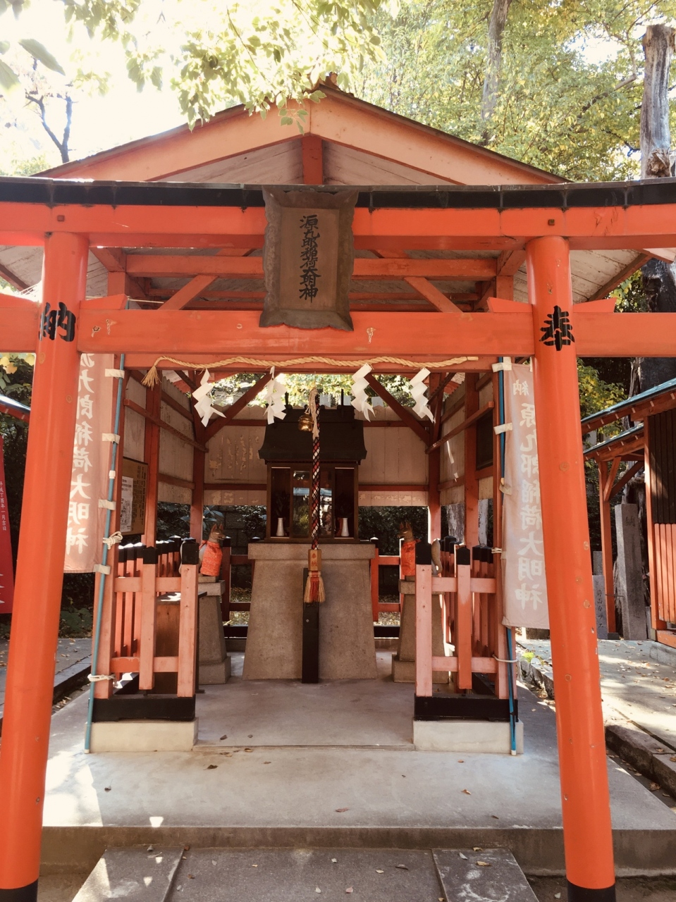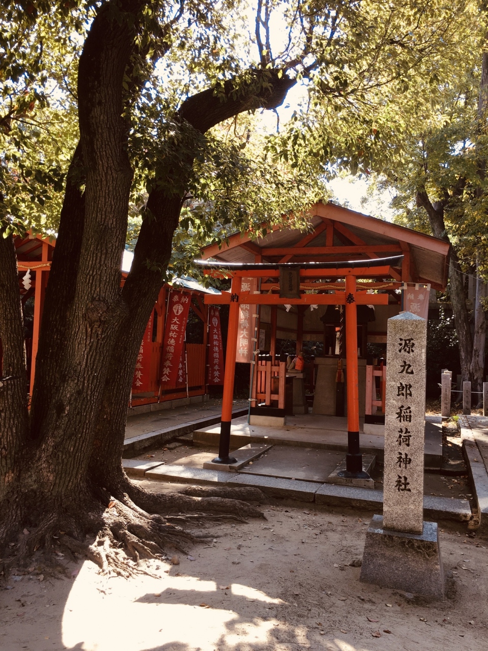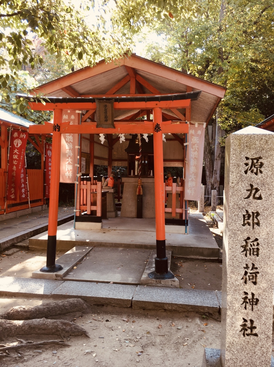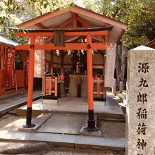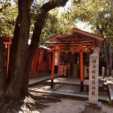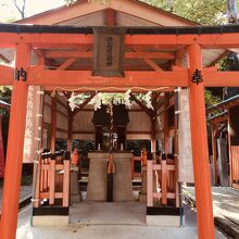 赤い建物が3つ並んだ真ん中にある神社で、左右の神社も似たような外観でした。手前に大きな木があって、鳥居があり、直ぐに祠がある建物です。石台の上に祠があり屋根には後方の木の枝が伸びていました。左右の狐像の歯が鋭かったです。