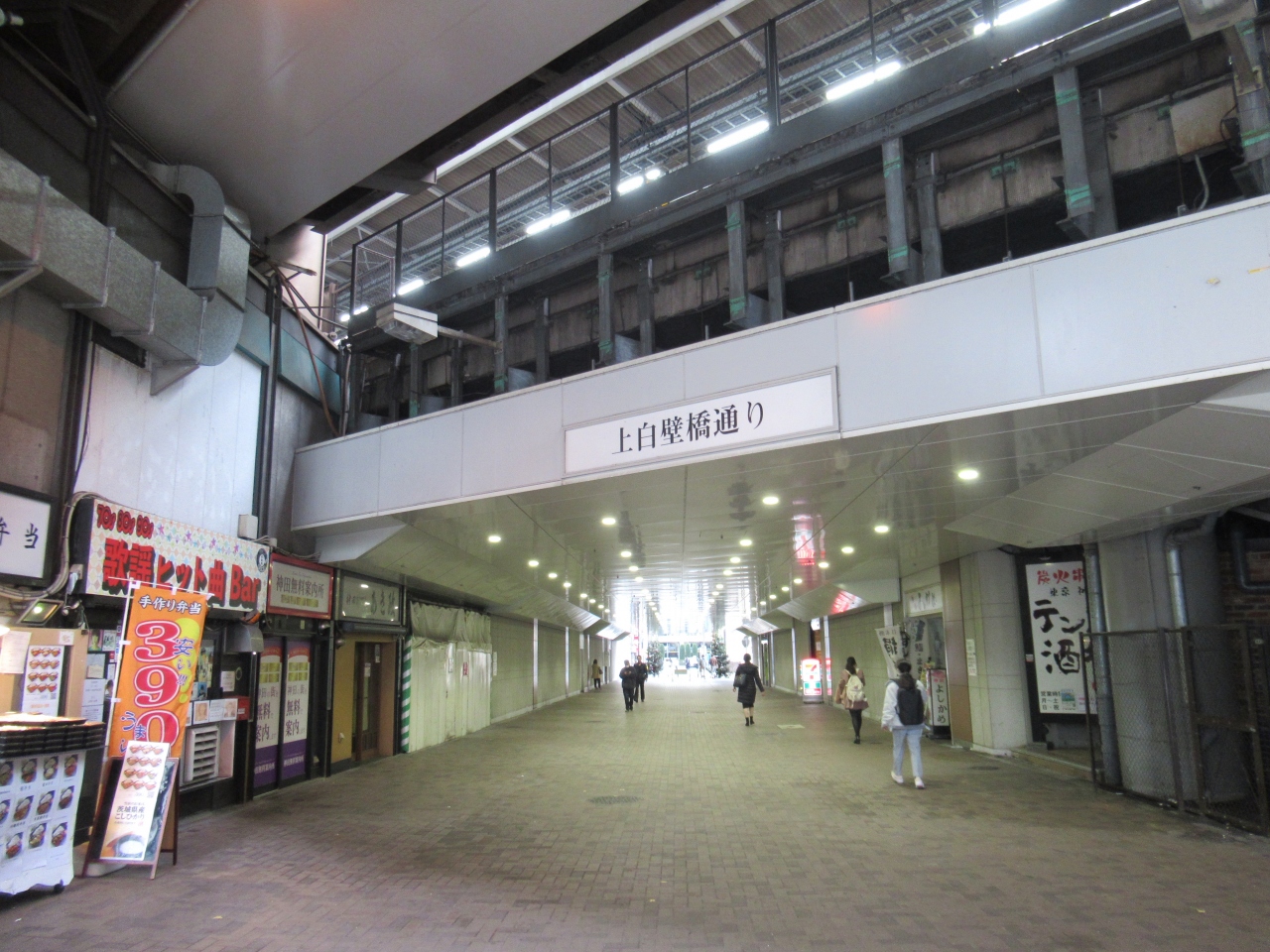 JR神田駅から秋葉原駅に向かって、高架橋や架道橋を巡りながら散歩をしていた際に立ち寄った架道橋です。神田駅北口から1分ほど、東口と西口を結ぶ歩行者専用道路・上白壁通りに架かっています。鉄骨やコンクリートがむき出しになっている架道橋が多い中、この架道橋は天井部分に照明もあり、壁もきれいに整えられていて清潔感があります。橋の入口には神田駅交番があり、橋の下にはコンビニや洋食店、バー、おでん屋などが店を出しています。