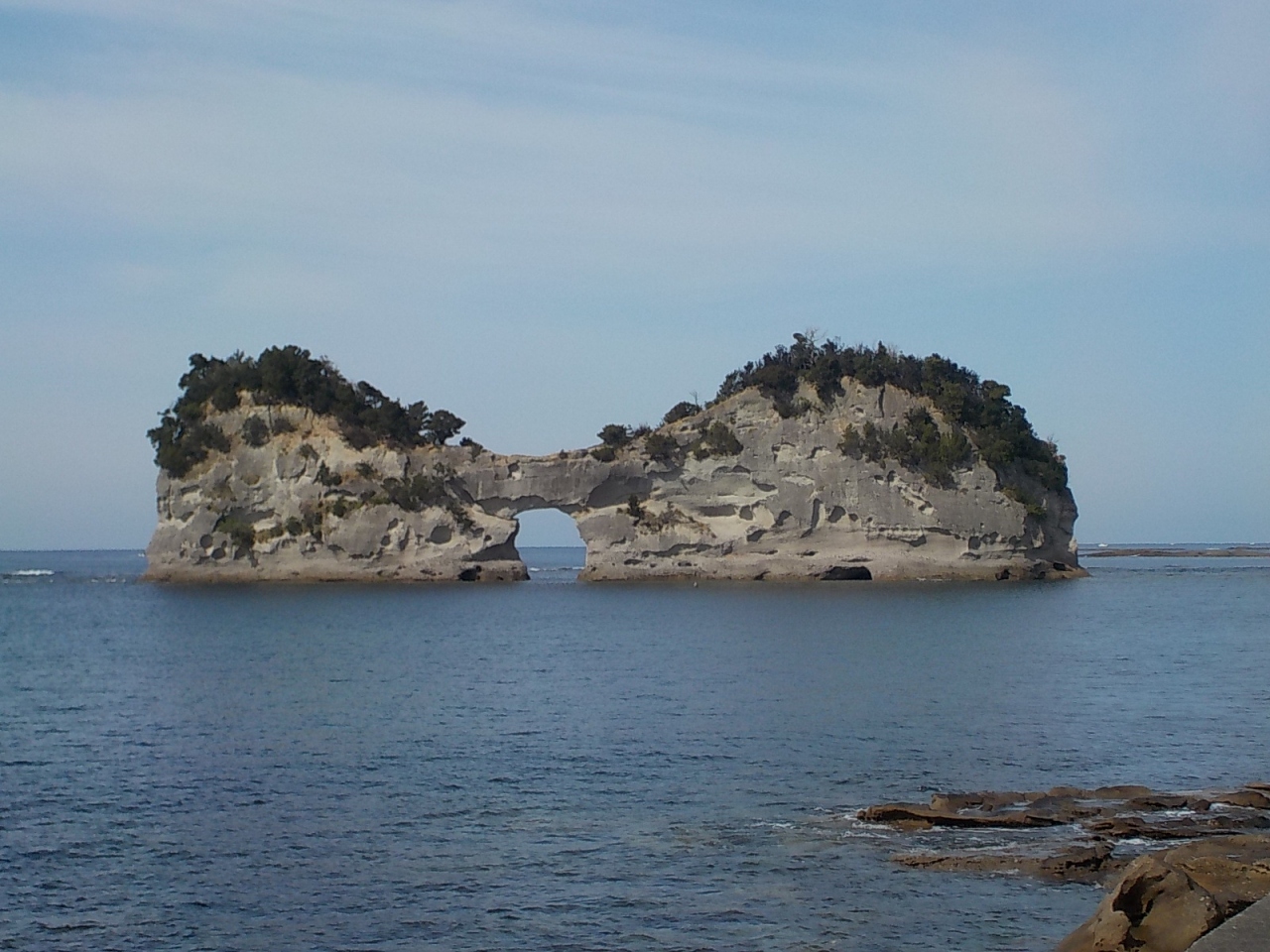 円月島は臨海浦の海岸線の沖合にある目測ですが幅100m以上、高さは20m余りある島です。正式な島の名称は「高嶋」だそうです。島のど中央に丸く円形に浸食されてできた穴が開いているので「円月島」という名がポピュラーになっています。時間が合わなかったのですが、観光パンフレットで見た島に沈む夕日を見たかったのですが残念でした、