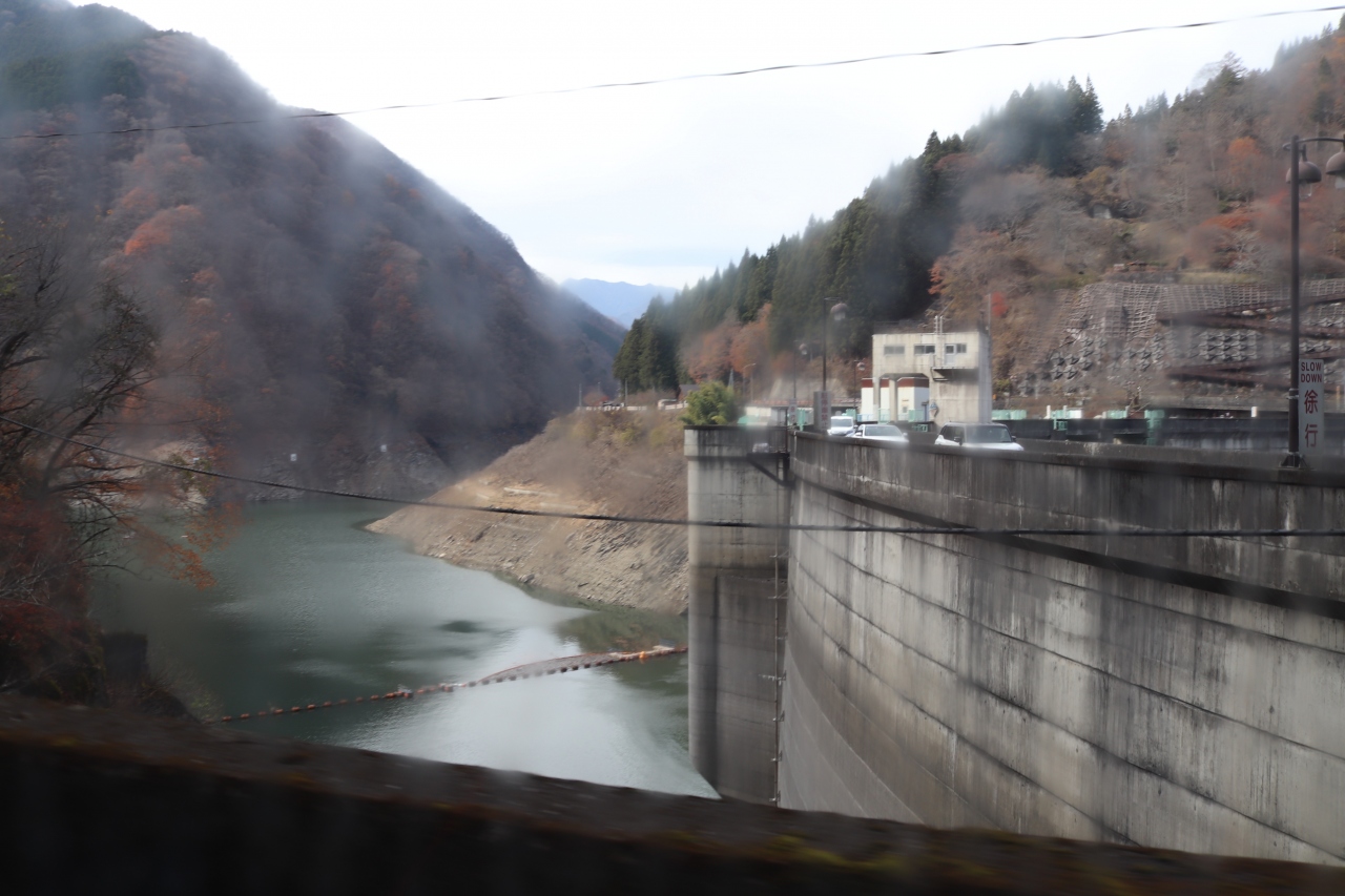 西武秩父駅から三峯神社まで結ぶ西武の路線バスの車窓から眺めました。かなりの山岳路線で狭い道をひっきりなしにすれ違うのは秩父湖をせき止める二瀬ダムの災害復旧工事のダンプでした。11月下旬、ダム湖の水量は少なかったです。今度は途中下車してみたいポイントです。