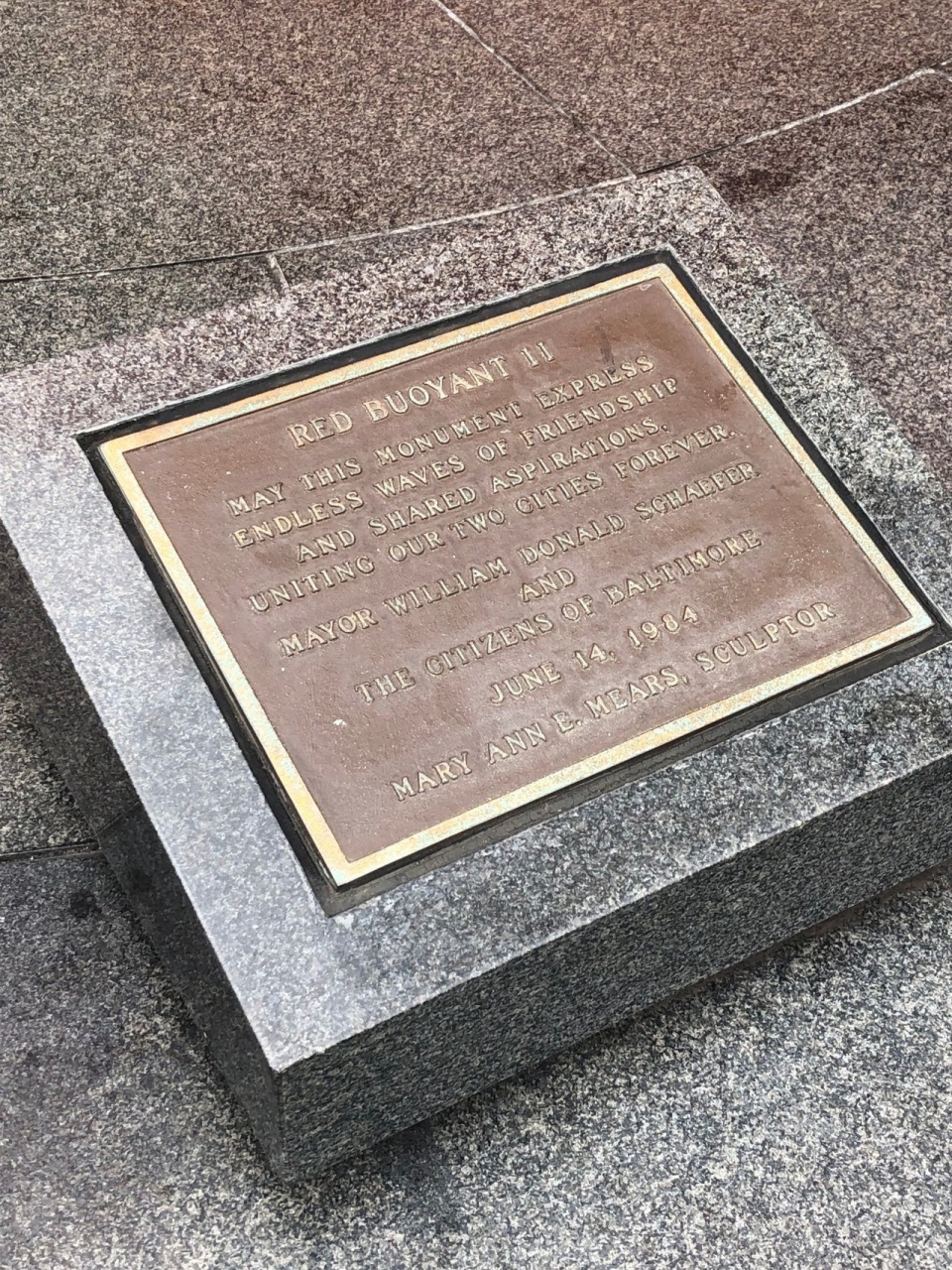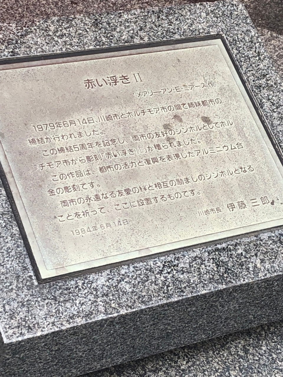 ボルチモア市と川崎市が姉妹都市となり5周年をむかえたときにつくられたモニュメントとなっています。このことがモニュメントの近くに英語と日本語で示されています。