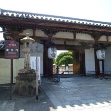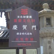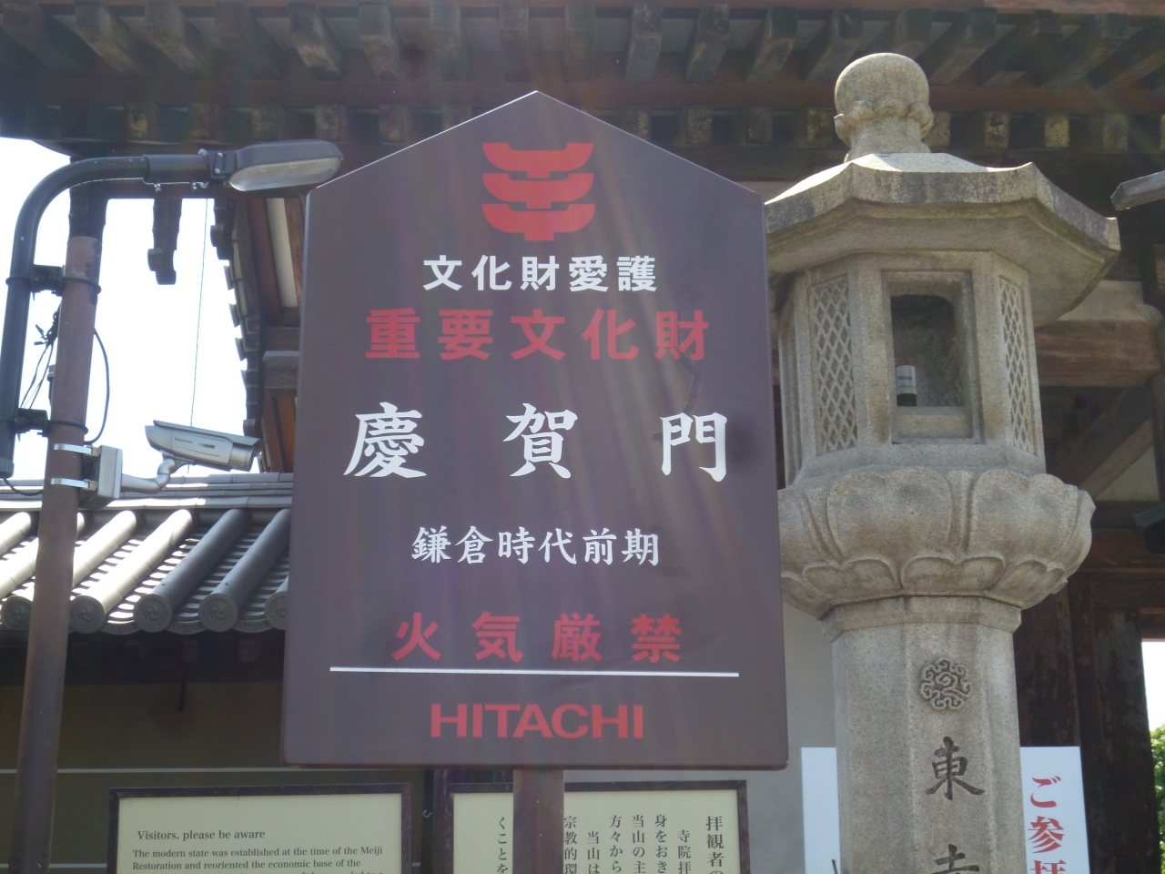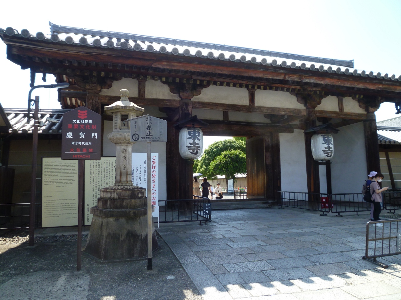 東寺を囲む築地塀には、6つの門があります。大宮通に面する東側には、東大門より北にもう一つ門があります。鎌倉時代前期建立の、切妻造、本瓦葺、三間一戸の八脚門の慶賀門です。京都駅から一番近い門で、門の北側には駐車場もあるので、東寺の正門である南大門よりも人通りが多いかもしれません。鎌倉時代前期に造られた八脚門で、国の重要文化財にも指定されています。とても見ごたえの感じられる門です。