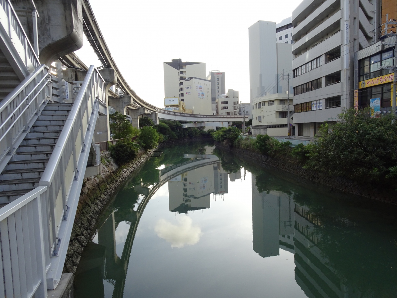 久茂地川は、ゆいレールの県庁前駅のそばとか那覇市の中心市街地を横断する川。最後は国場川に合流しますが、いずれにしてももう海に近い場所ですから、流れはどんより。水質もあんまりよくないのかな。眺めていて気持ちのいい川ではなくて、都会の川といった感じです。