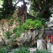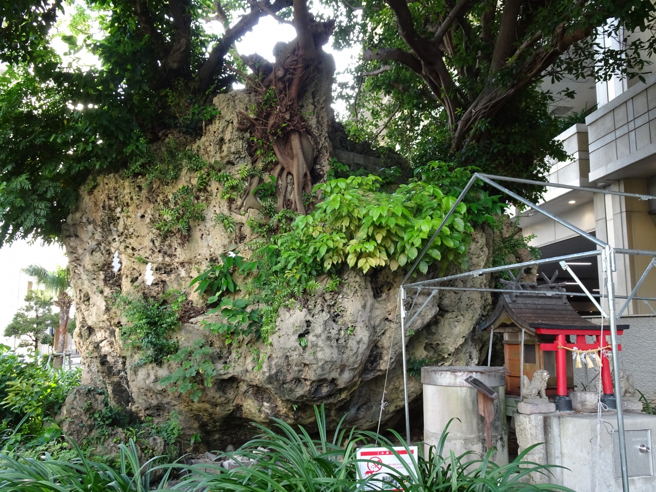 仲島の大石は、那覇バスターミナルに面した通り沿い。高さ約6m、中央部の周り約25mの琉球石灰岩。下の方は、波に侵食されてへこんだ形になっていて、かつてこの辺りが海岸であったこと示しています。説明板があって、地元では縁起の良い岩として大切にされてきたそうです。