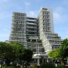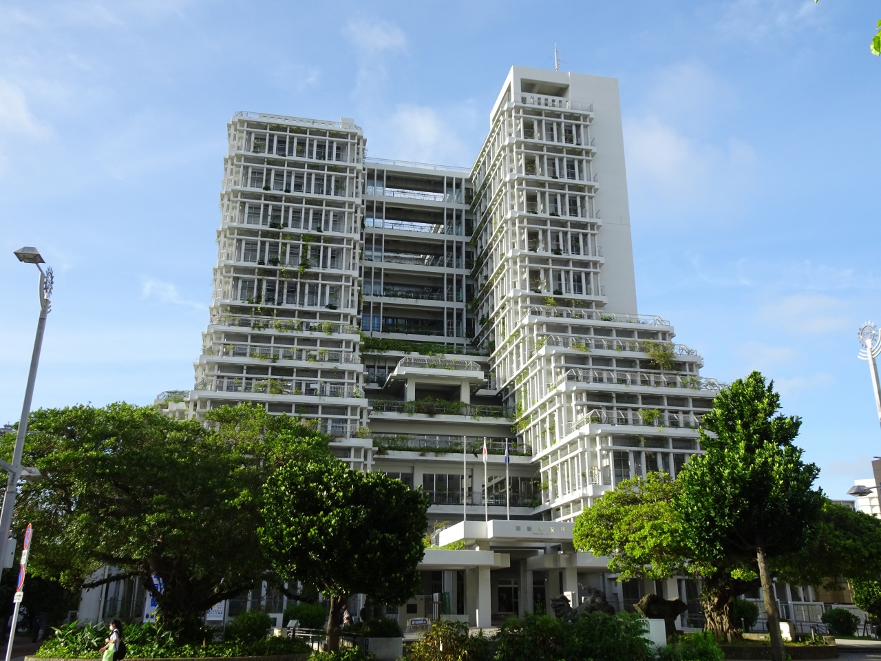 那覇市役所は、沖縄県庁の隣り。同じ大通りに面しています。ただ、そのインパクトのあるデザインは大いに目を引くところ。リゾートホテルか高級マンションのような雰囲気に、各階に緑をおしゃれにあしらっていて、奇抜なところも感じます。那覇のランドマークとなっていると思います。