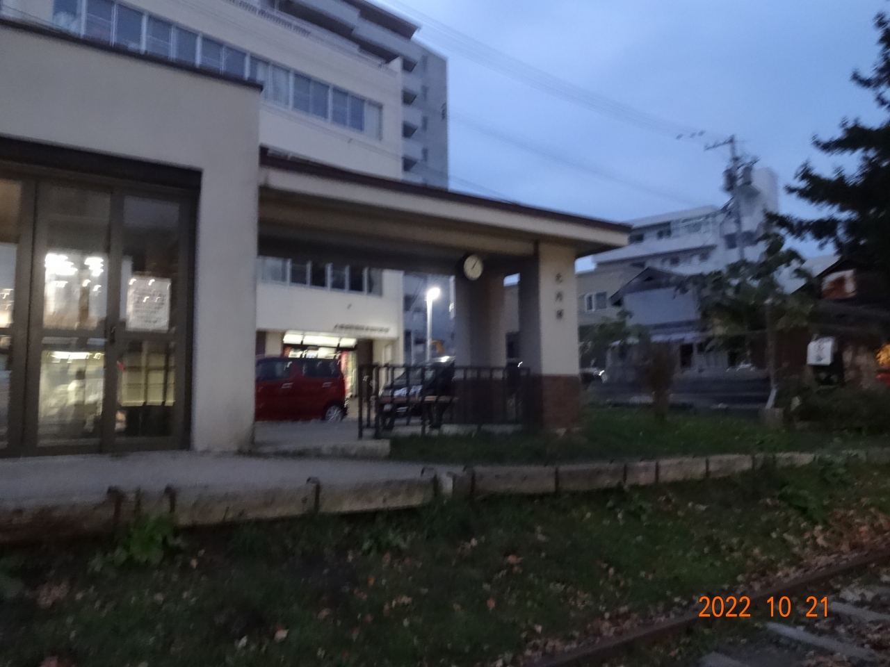 日銀通りを西に歩いていると、右側に手宮線の線路があるので、駅の方向に右折すると、すぐに小さな駅の建物がありました。建物の中に入ってみたのですが、何もない小さな建物でした。駅の周辺も閑散として薄暗かったです。