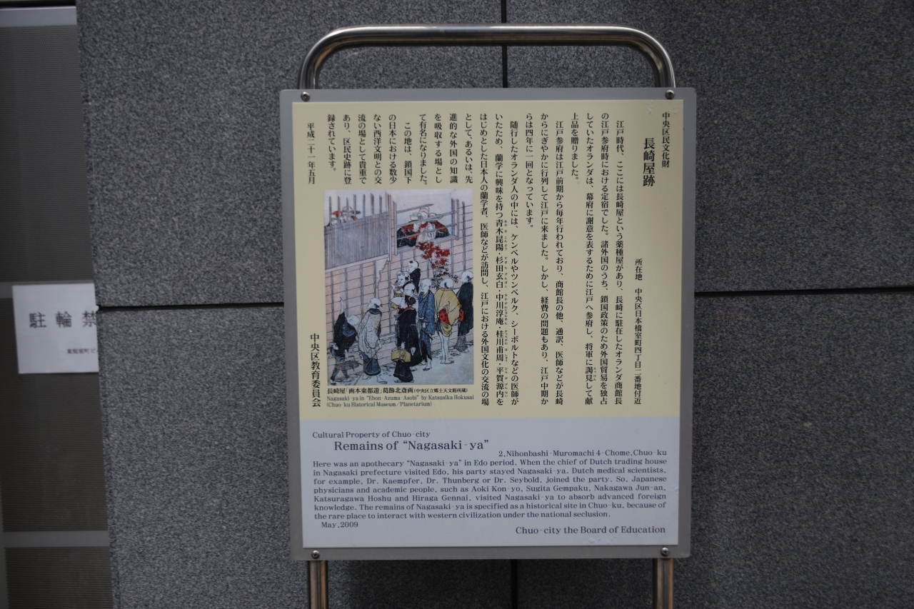 日本橋の交通量の多い歩道にある小さな碑です。かつて江戸時代にこのあたりは商業施設で賑わっていました。長崎屋とは出島のオランダ館から来た商人が開いた店で通商を行っていました。江戸の将軍の御用達でもあったと言われています。