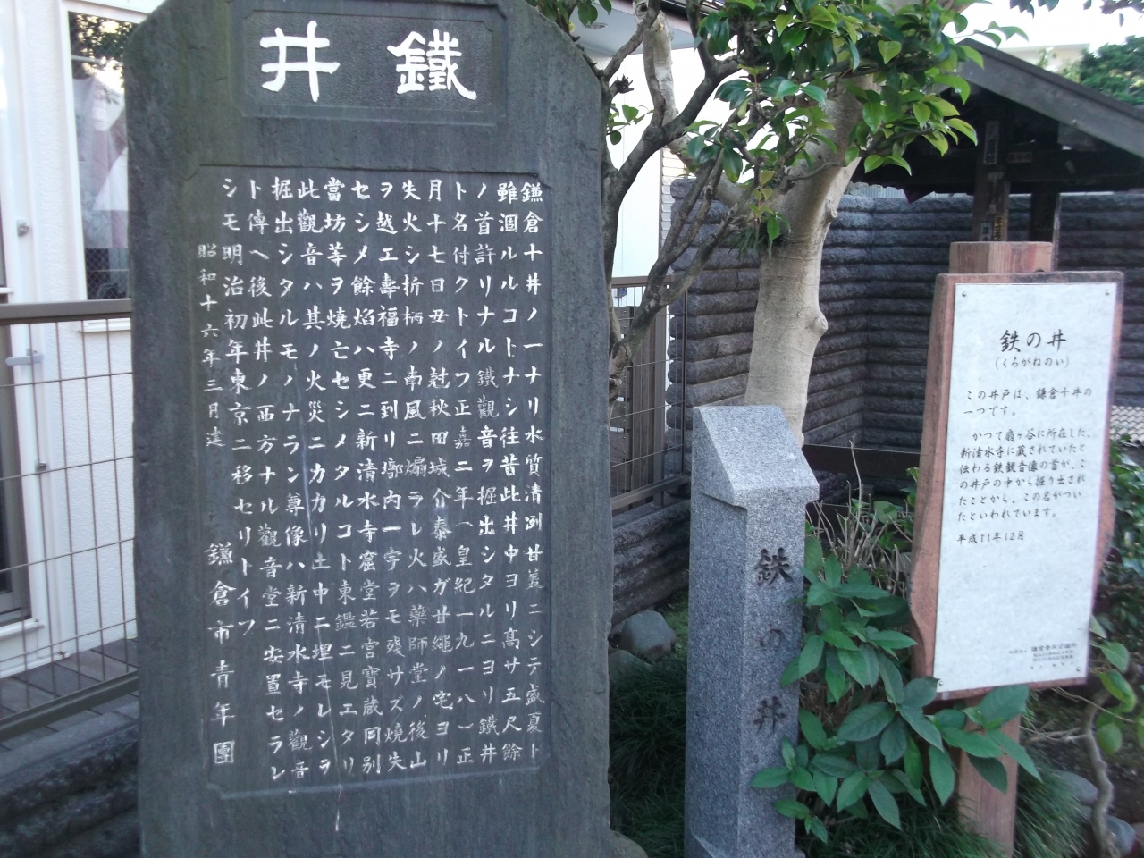 小町通りを八幡宮方向にまっすぐ進むとその一番奥の角に、この石碑が建っています。かつての井戸の跡で、鎌倉十井の一つだそうです。名前の由来は、この井戸からお寺の鉄観音像の首が掘り出されたからだとか。ちょっと不気味です。