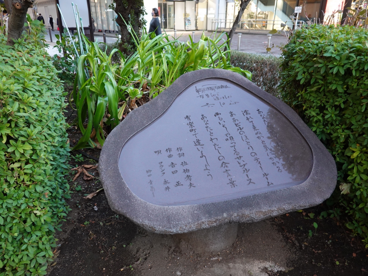 有楽町マリオンのすぐ近く、植込みの緑の中に「有楽町で逢いましょう歌碑」があります。目立つことを避けるかのように地味な石碑で、足を止める人はほとんどいませんでした。前回、暗くなってから訪れたので、改めて明るいうちに足を運んでみたのですが、周囲の光景に溶け込んでおり人目につきにくいと感じました。