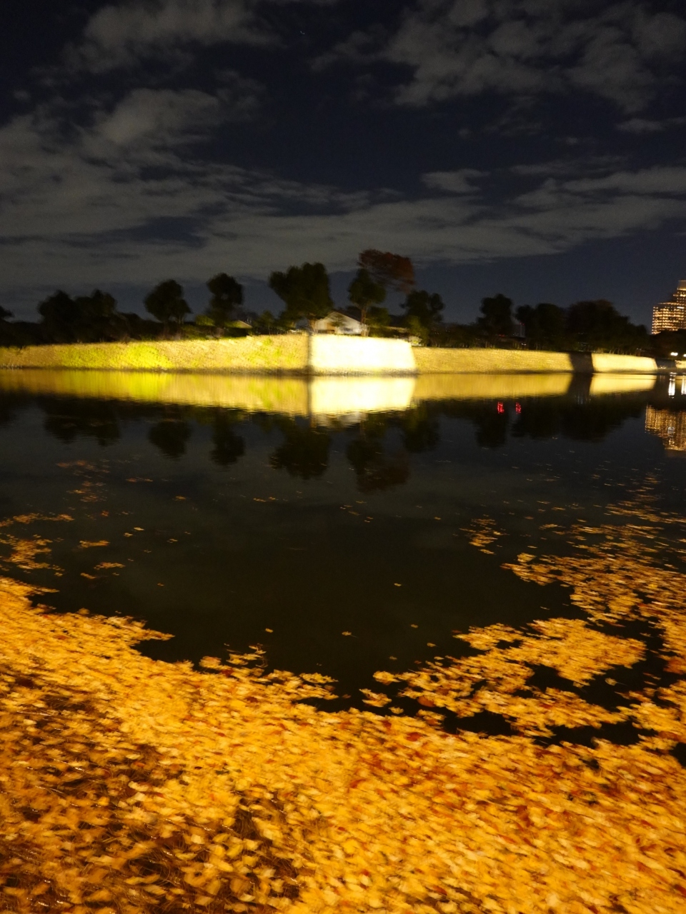 11月末、夕食後の散策で皇居近辺を訪れました。日没後の皇居外苑は予想を超えて印象的な光景でした。日比谷濠にはイチョウの葉が浮かび、お濠のイチョウの葉と石垣がライトアップされて、暗闇の中で黄金色に輝いていました。紅葉の時期ならではの光景と感じました。