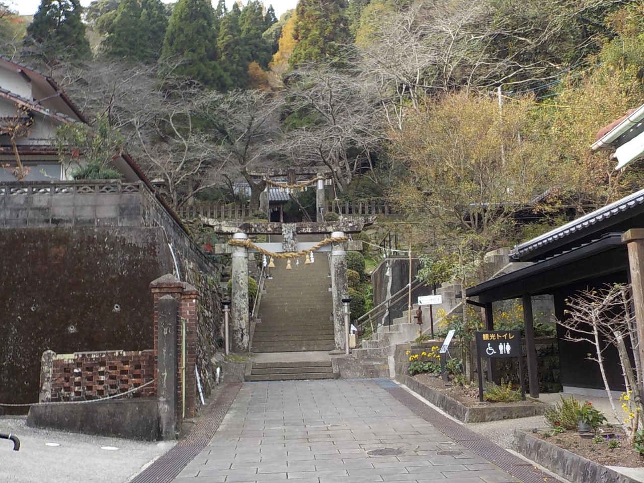海上交通の安全と豊漁を祈願するために江戸時代初期に創建されたそうです。天草市内で最も古い神社で津集落の鎮守社です。キリスト教が禁教であるとされていた時代には、津集落にいた隠れキリシタンは、カモフラージュするためにこの神社の氏子となって参拝していました。拝殿の前では心の中で「オラッショ(キリシタンの用語で「祈り」の意味)」を唱えていました。この神社は隠れキリシタンが持っていた信仰の品々を差し出すように指定された場所でもあります。