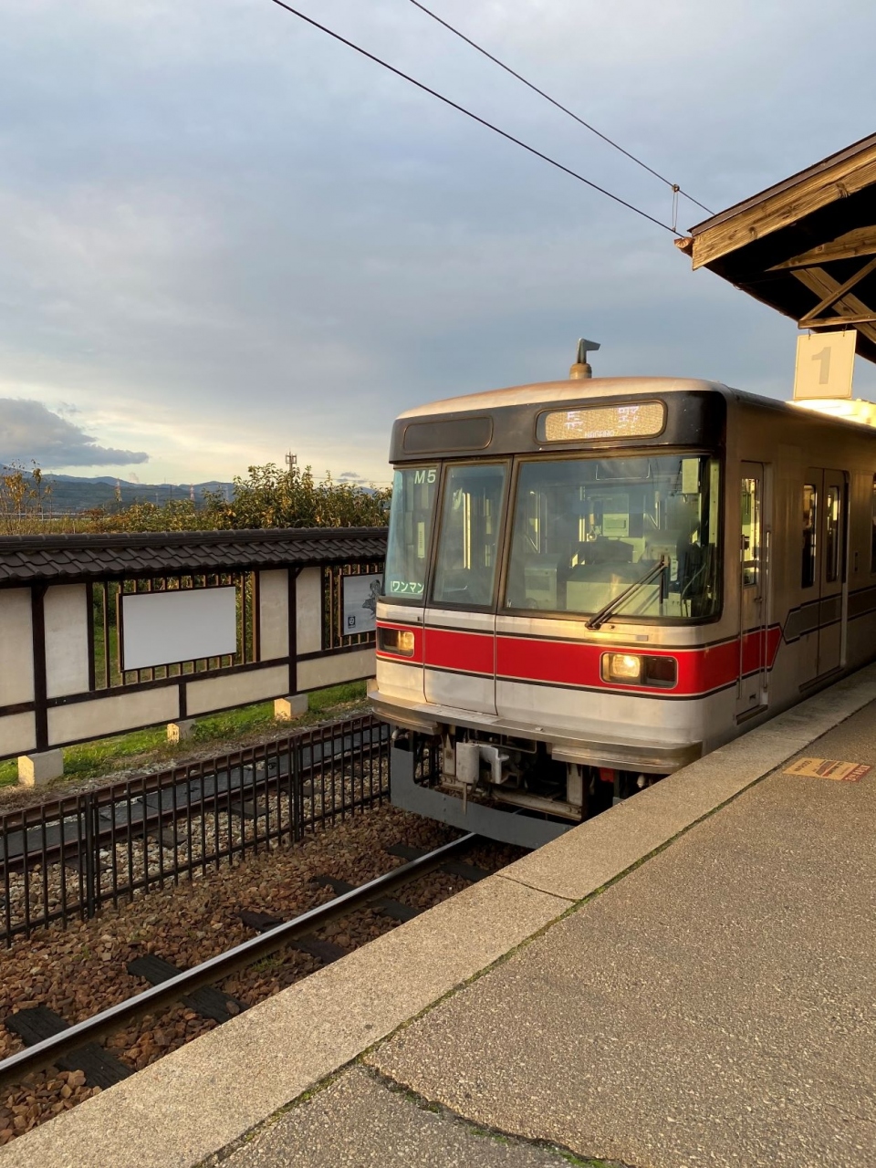 小布施から長野まで乗車しました。車両はこれもどこかで見たぞと思ったら日比谷線の車両で前面に赤いラインを入れているのですね。高校生の帰宅時間で混んでいたので座りませんでしたが車窓から見える山々を目に焼き付けらたので苦にならなかったです。