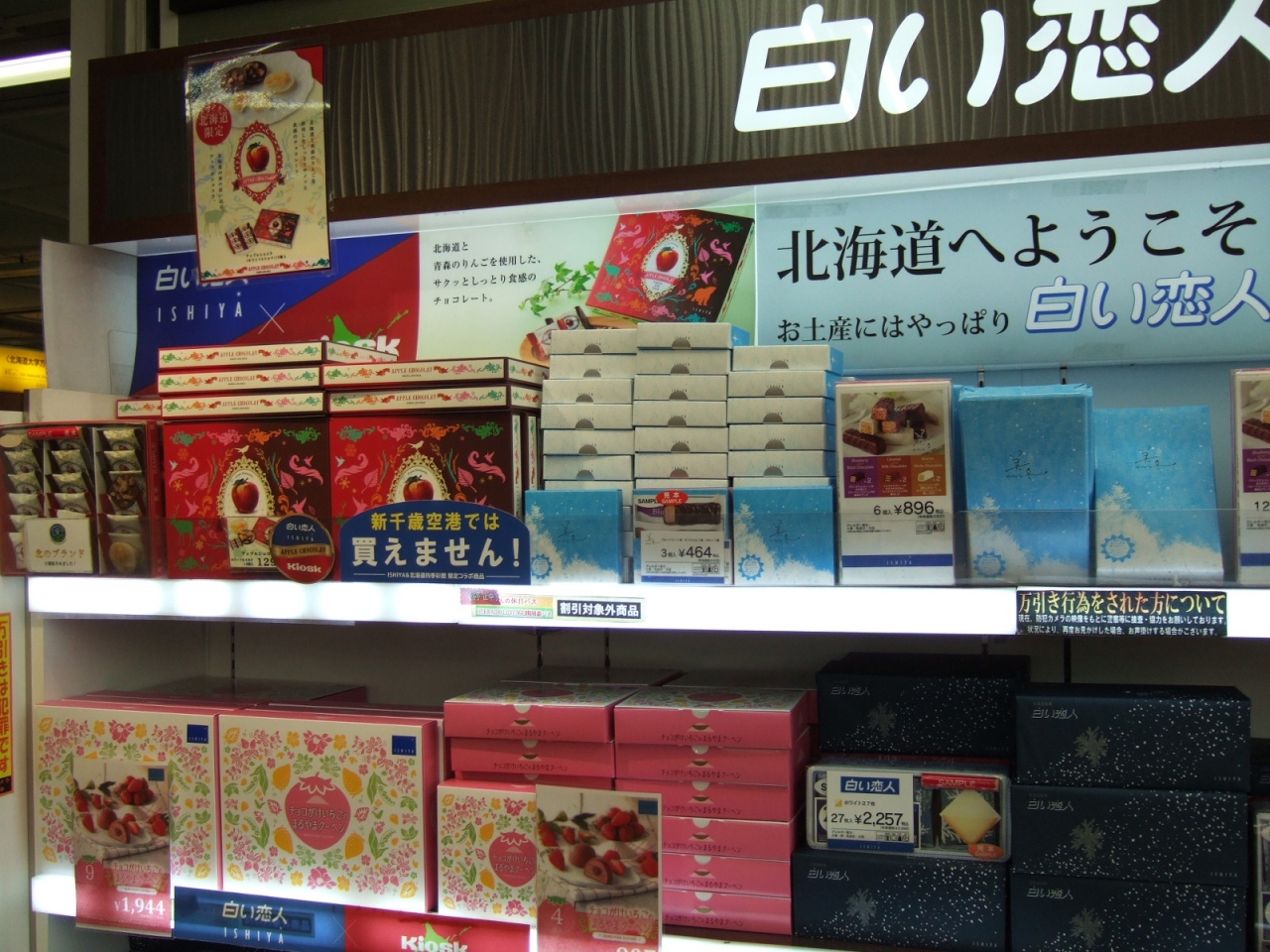 北海道のお土産は新千歳空港でも買うことができますが、こちらではキヨスクと石屋製菓がコラボした商品などがあり、空港では売っていないものも並んでいるので必見です。