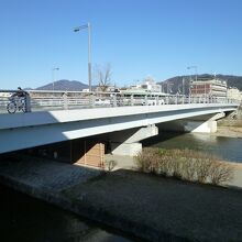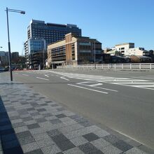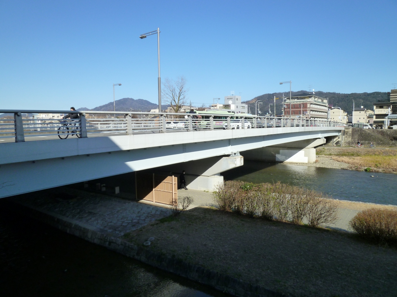 御池大橋は、御池通りの東端にあり、南北に走る川端通に繋がっていますが、川端通の先は行きどまりとなっています。大きな橋でこの橋を渡って北と南に分かれ、交通量の多い交通の要所となっています。この橋は1964年に第一期分が完成し、1984年と1988年に拡幅工事が行なわれています。橋の西側には夏目漱石が宿泊したことにちなみ句碑があります。この地にはかつて旅館「北大嘉」があったそうです。鴨川にかかっている橋の中では近代的で平凡な橋だと思います。