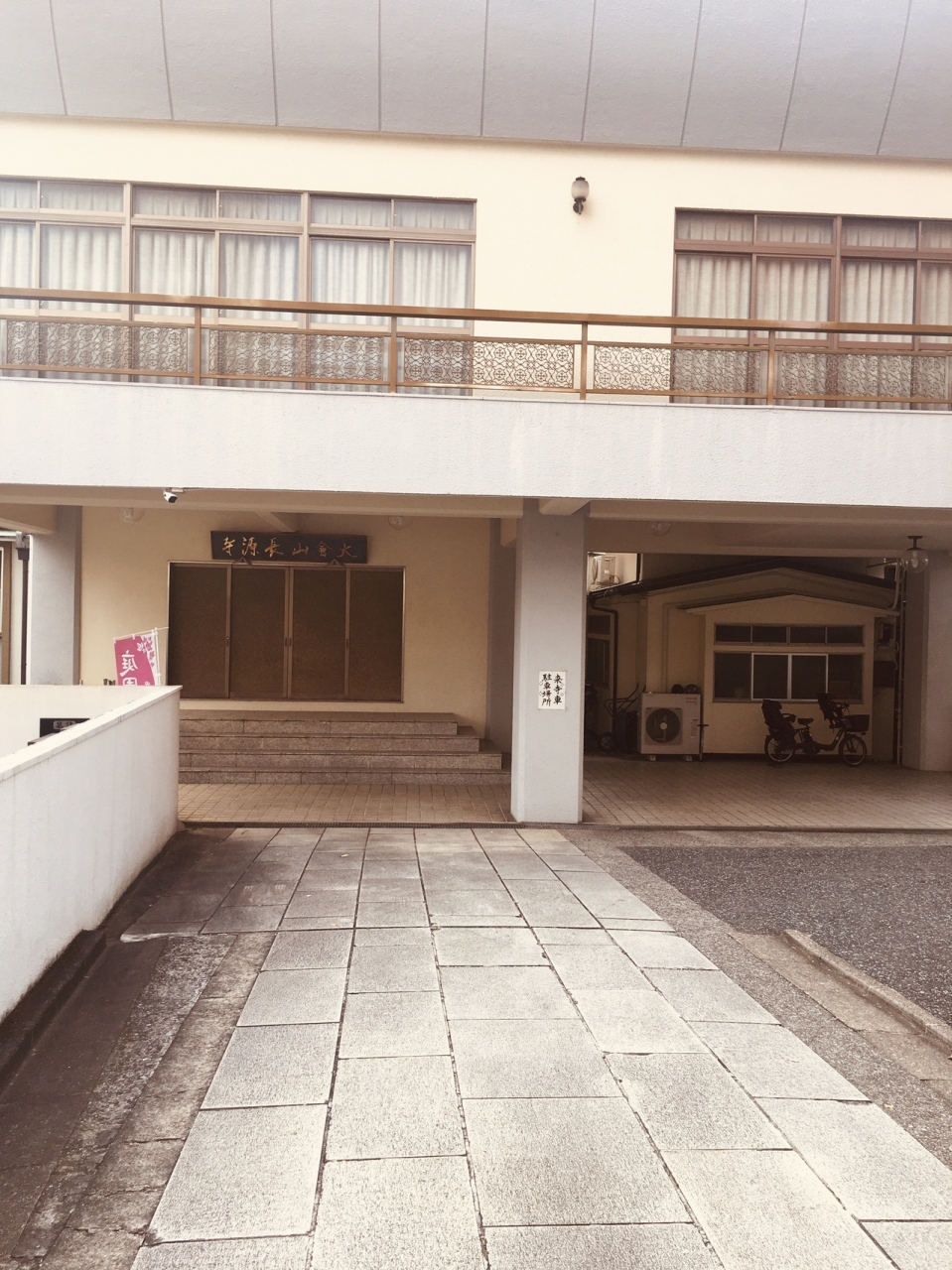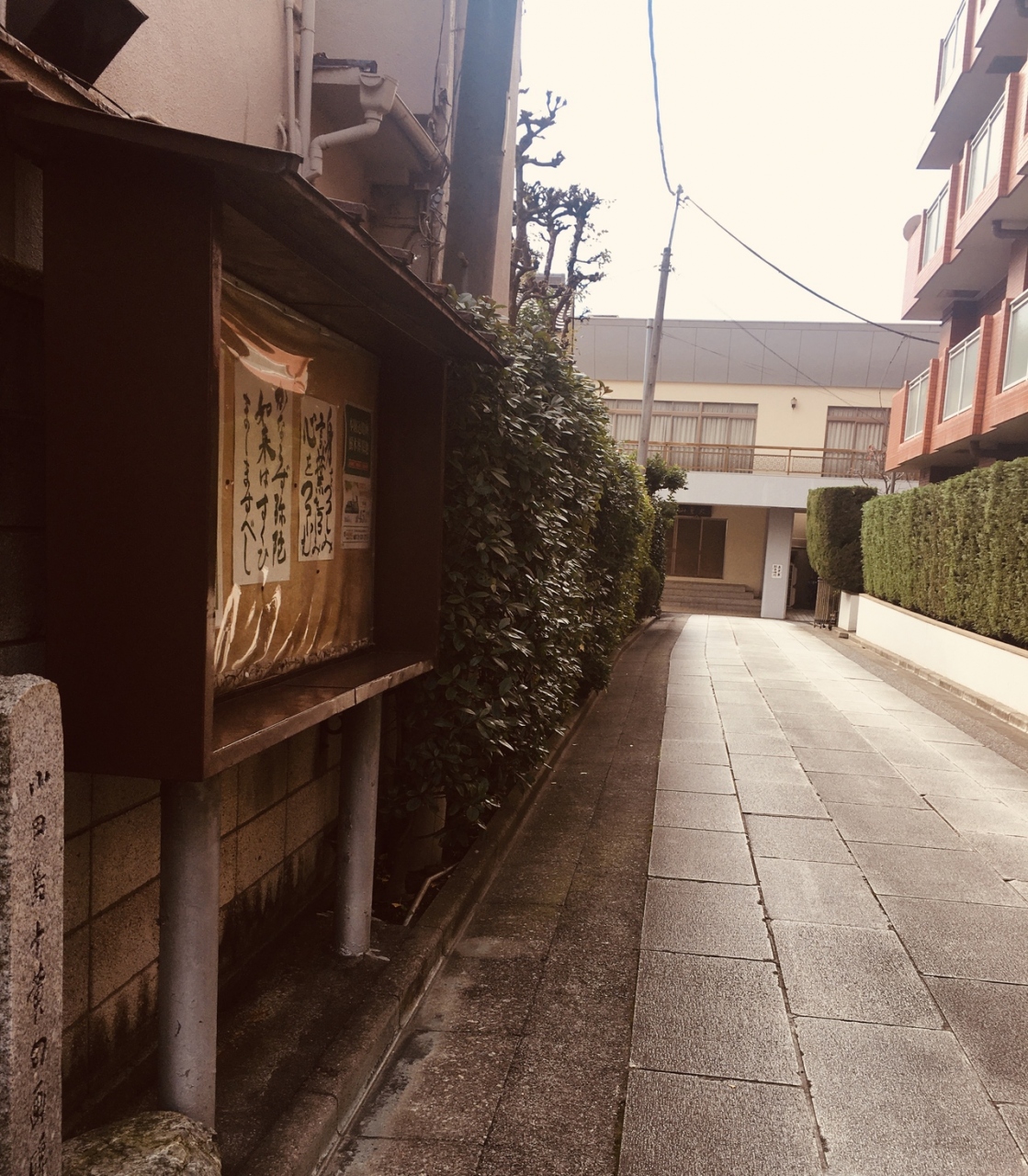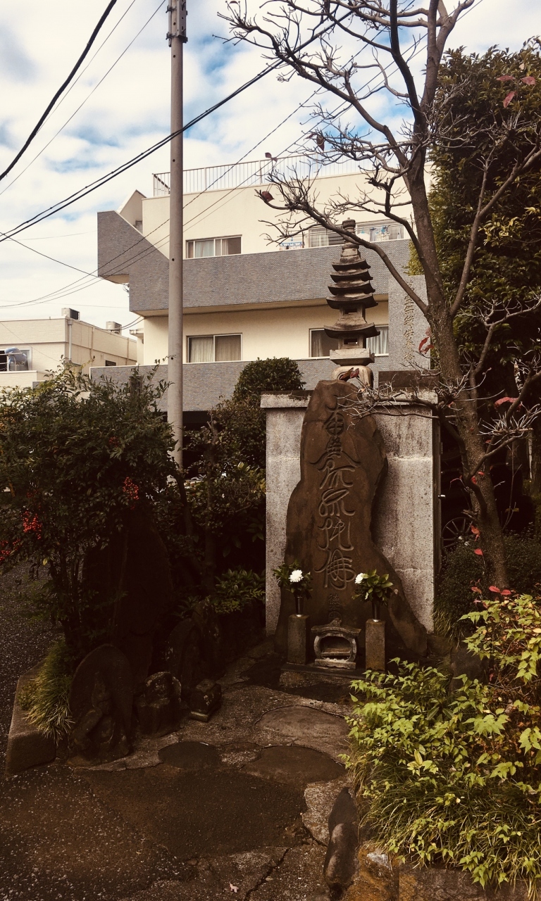 境内入ると石の道が伸び、右側にはマンションが建っていました。参道左右の草木が綺麗に刈ってあるのが印象に残りました。左側には掲示板と石碑があり、本堂は2階建の寺らしくない建物でした。本堂の左側が墓地になっています。