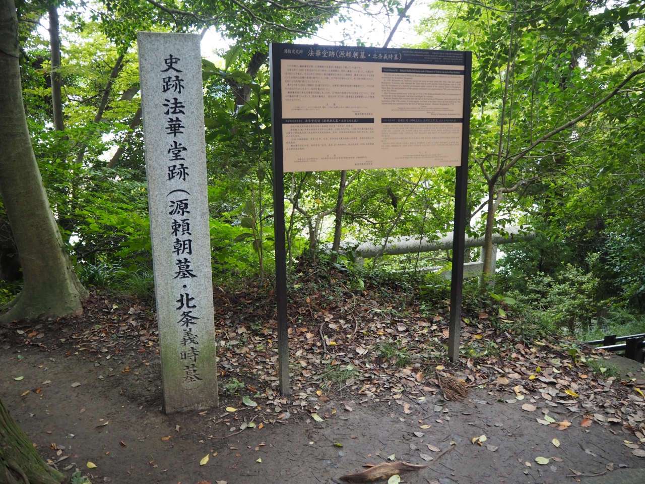 法華堂跡(源頼朝墓、北条義時の墓)は鶴岡八幡宮から東へ10分ほど歩いた山裾の斜面にあります。白幡神社の横の道の階段を上っていきます。頼朝と義時の墓は近くですが、上り口が違うので、一度階段を上って降りて上るという形になります。墓のある場所には記念碑と説明板があるのみです。意外と簡素な感じです。