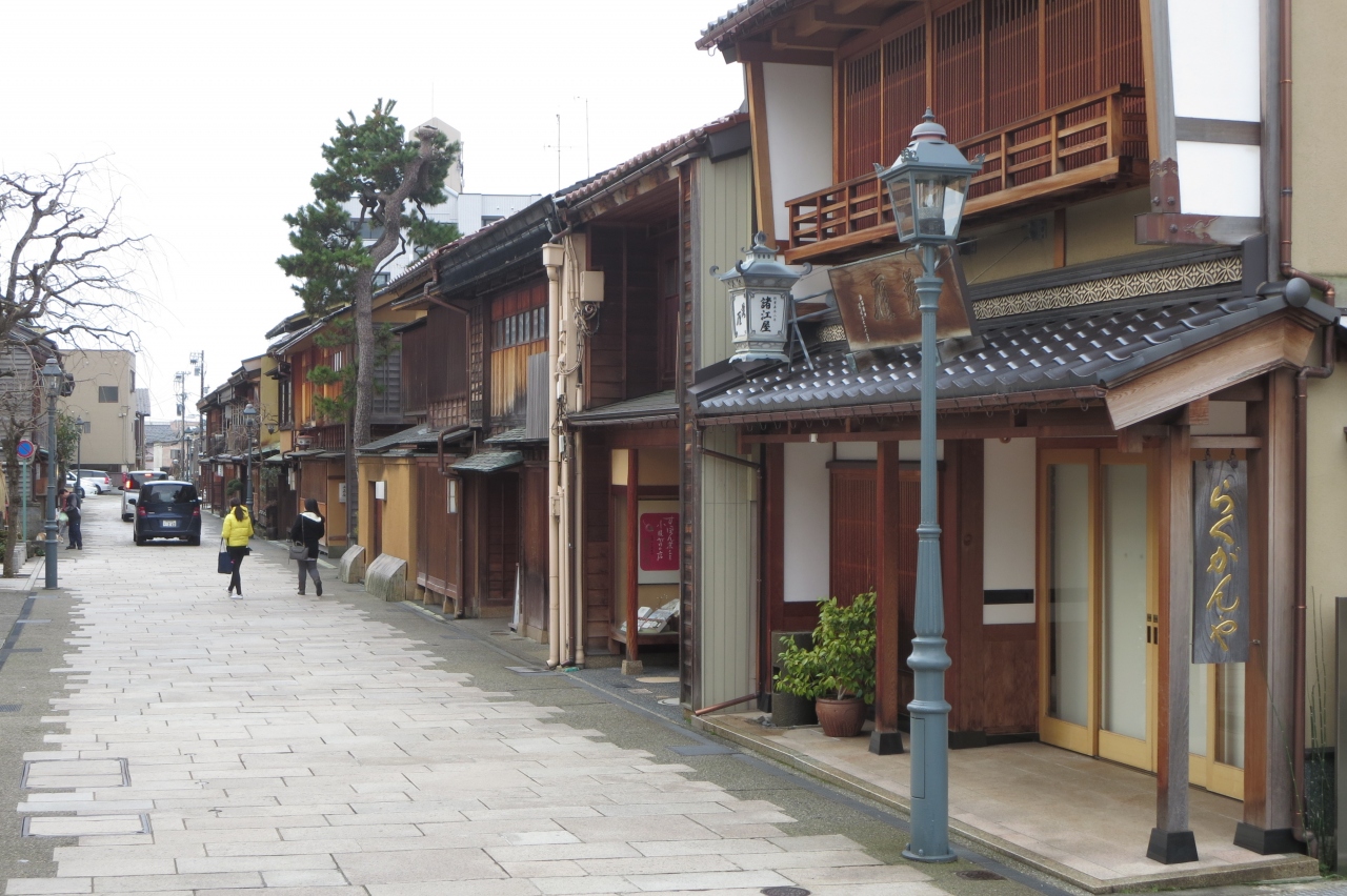 JR金沢駅からバスで15分位、広小路下車ですと案内されましたが、金沢の町並みを見ながら歩いて行きました。結構遠くて40分ほどかかりましたので、時間から考えると3㎞ほどかなと思います。途中で武家屋敷跡などもあるので歩くのもよいかなと思います。東茶屋街と基本的には同じなんですが、東茶屋街の建物が風情があるので、観光客は東茶屋街に行くのだと思います。