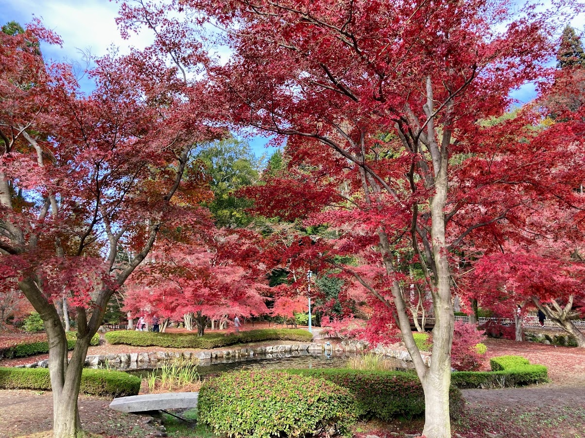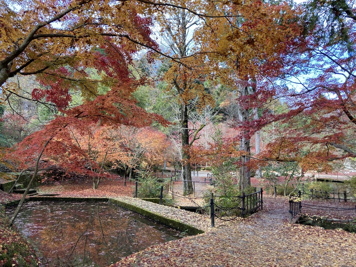 令和4年度のライトアップも残念ながら中止のようですが、日中でも、大小の池に逆さ紅葉が綺麗に映り、燃えるような紅葉が見事でした。