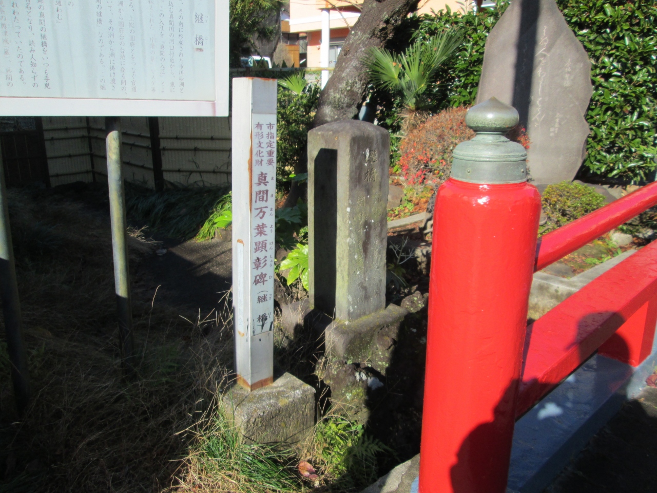 上総と下総の国府をつなぐ官道がこの市川砂洲を通っていた。この地域が真間の入江の開口部であったころ、いくつもの洲を渡るために架けられた橋の一つです。今は赤い欄干と説明版があるのみです。脇には真間万葉顕彰碑が建っており、万葉集が編纂されたころよりここに橋が架かっていて、歌の題材になったほど古い歴史がある橋だと感心しました。他の二つの真間万葉顕彰碑(手児奈霊神堂前と亀井院前)と併せて見られることを推奨します
