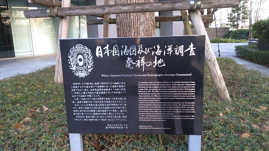 都営地下鉄大江戸線築地市場駅出てすぐ、国税局前に説明板が立っています。日本国として初めて海図を作成したり、海洋調査を行った兵部省海軍部水路局が建っていた場所です。駅からはすぐですが、見逃してしまいそうな場所にありますので、ご注意を!