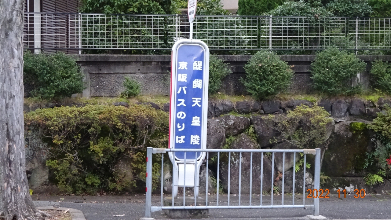 醍醐寺から市営地下鉄小野駅に向かう途中に、偶然、醍醐天皇陵前のバス停が有ったので気が付きました。