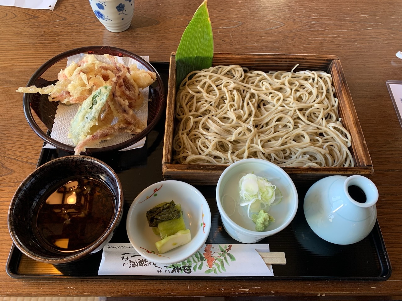 月山の街道沿いにある蕎麦屋です。民宿に併設されています。一人でランチを摂りました。いただいたものはゲソ天そば。カリッと揚がったゲソ天が美味しいです。窓からの眺めが良いので、旅行気分が盛り上がります。人気の店のようで、平日なのにお客さんが入っていました。