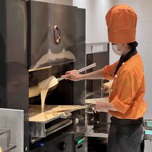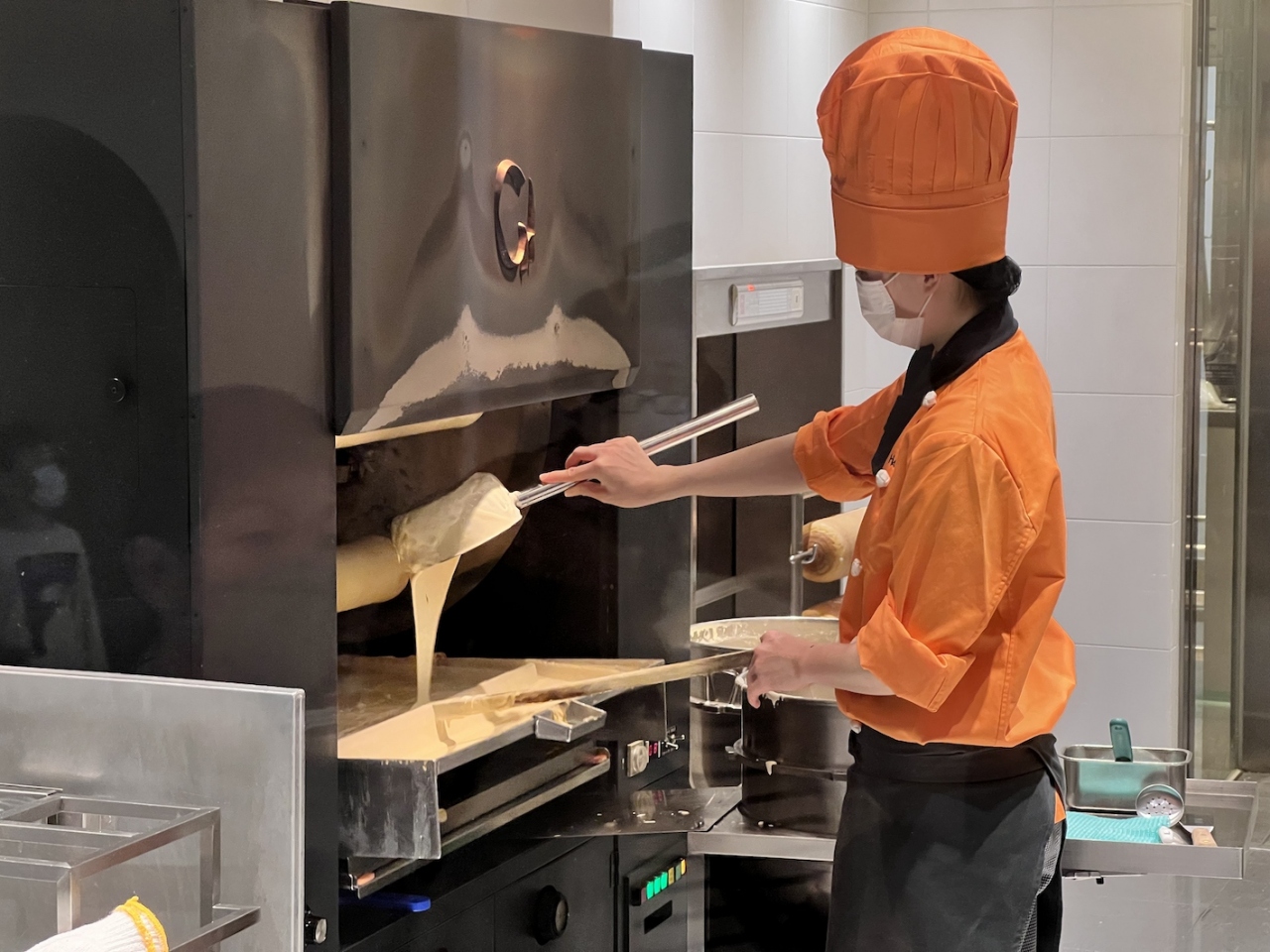 こちらのカフェでは焼きたてのバームクーヘンが頂けるのですが、1Fにある厨房がガラス張りになっており、作っている工程を見学することができます。