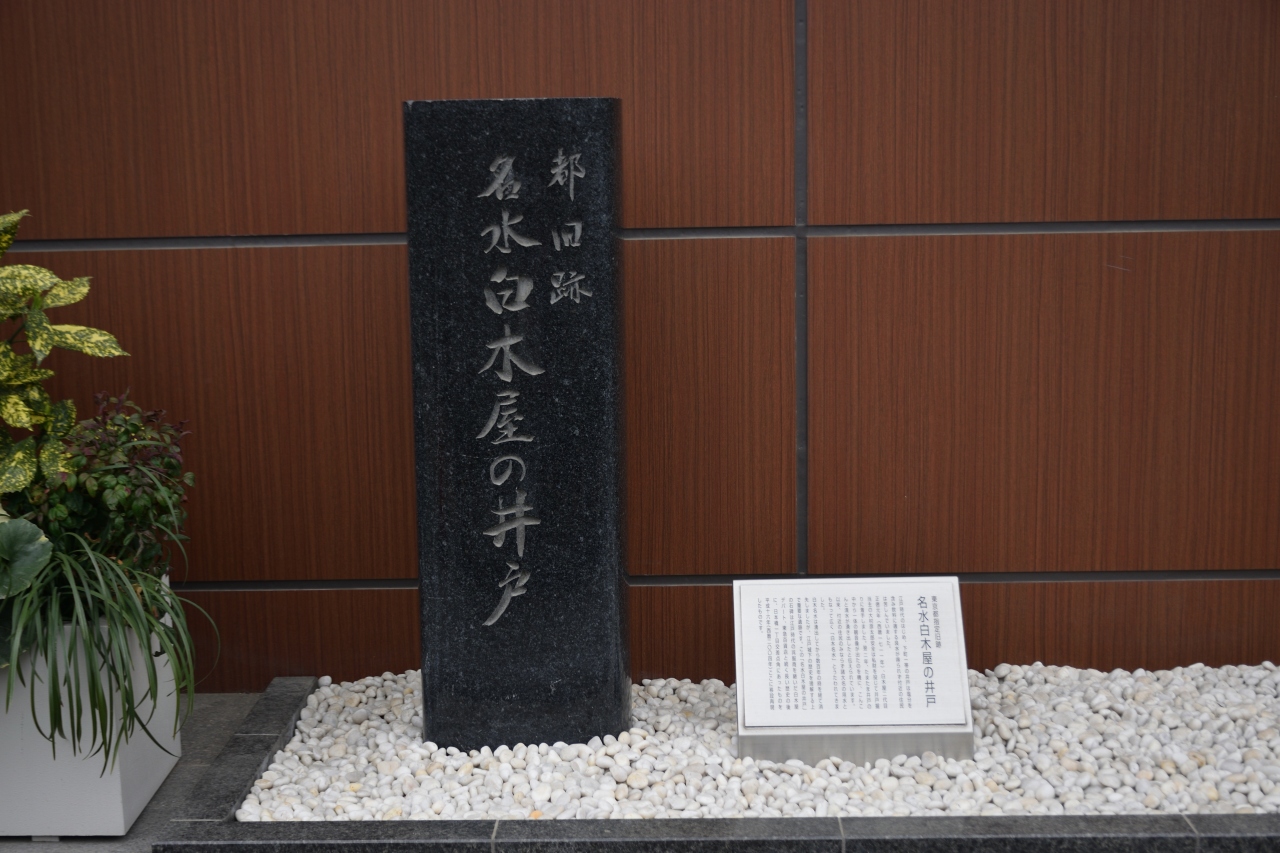 コレド日本橋の裏側にある細い路地に立つ石碑です。かつて江戸時代にはここは、呉服店がありました。江戸の三大呉服店として白木屋は営業していましたが、そこにあった井戸が名水であったようです。井戸こそありませんが、今でも語り継がれています。