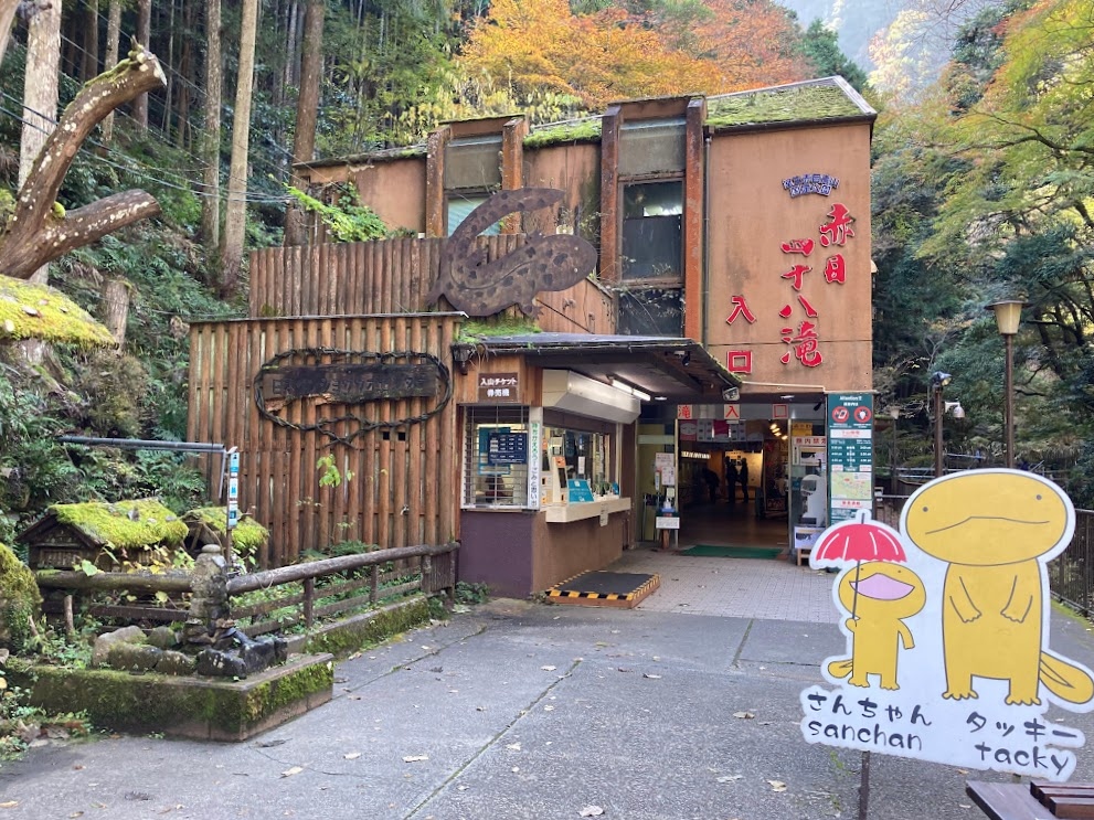 赤目四十八滝ハイキングの入口と書かれた施設で、「生きている化石」と呼ばれる特別天然記念物に指定されているオオサンショウウオが展示されています。