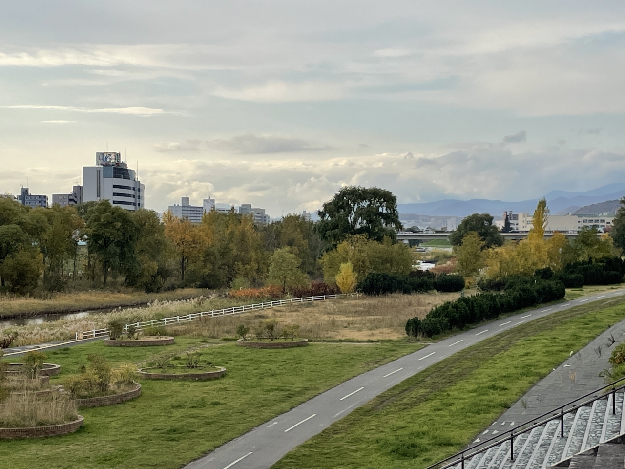札幌中心部を南北に流れる豊平川の右岸にある自転車道路です。藻岩上の橋から雁来大橋付近までを指し、園路沿いにはグランドやテニスコートの他休憩所などが整備されています。起伏もほとんどなく道幅も広めなので左岸より走りやすそうです。
