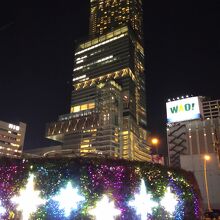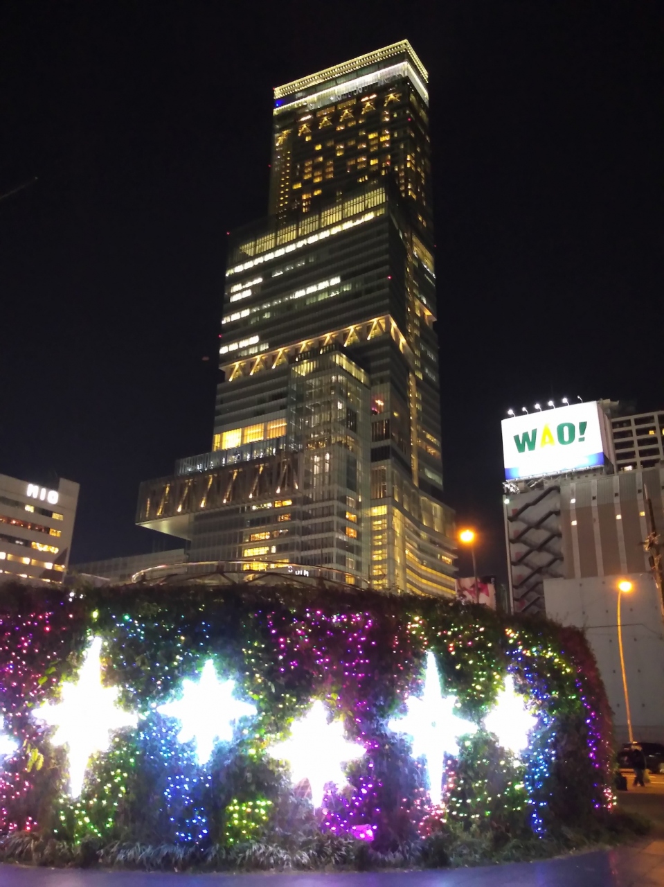 あべのハルカスをクリスマス飾りが施されたてんしばから眺めました。ここからの眺めはいつも素晴らしいですが、1年でクリスマスの時期が最高です。ビル外壁に飾りはありませんが、てんしばのクリスマスイルミネーションとの交わりが美しいです。